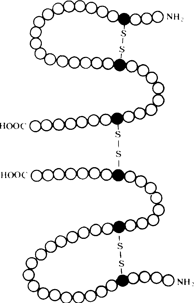 图1 蛋白质结构中的半胱氨酰二硫键 合成其它生物活性物质 生物素(维生素H)、硫胺素焦磷酸(维生素B1)、谷胱甘肽、铁氧还蛋白、辅酶A等都含有硫。维生素是构成许多辅酶的重要成分。谷胱甘肽是含有谷氨酰基(谷氨酸的残基)、半胱氨酰基(半胱氨酸的残基)和甘氨酸部分的三肽链。谷胱甘肽的氧化还原体系与胱氨酸/半胱氨酸体系相类似。其结构中都含有-SH基。二个谷胱甘肽分子中-SH基相结合,形成-S-S-键。