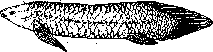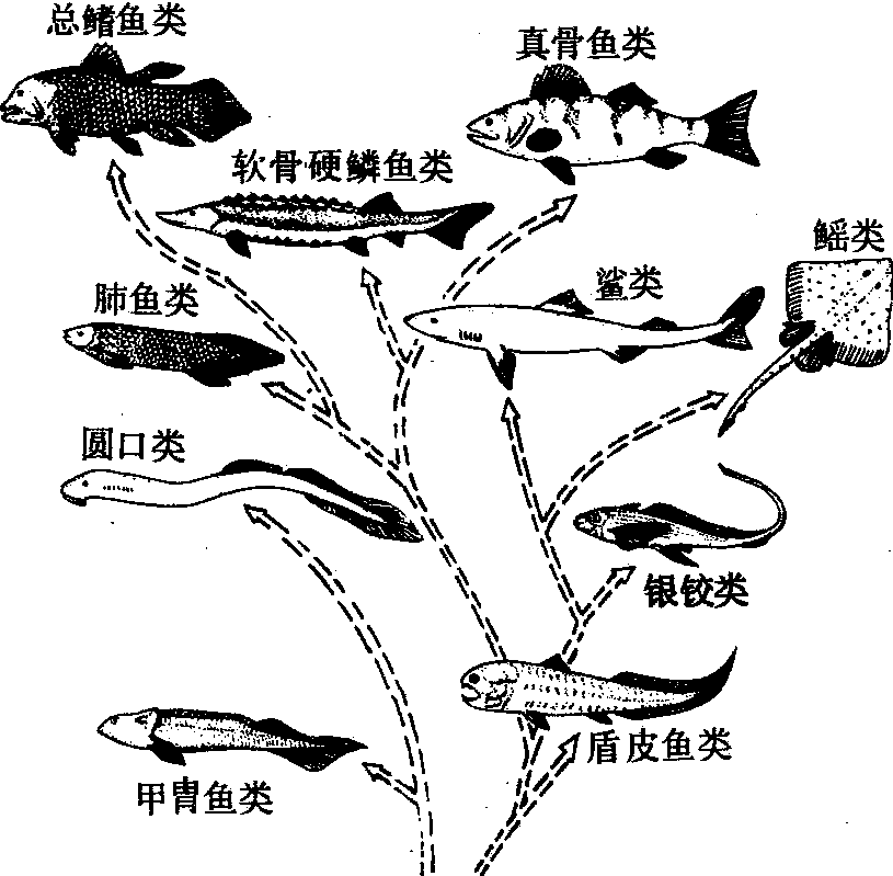 图 1 鱼类演化图 分类 硬骨鱼纲分为内鼻孔亚纲(Choanichthyes)和辐鳍亚纲(Actinopterygii)两类。内鼻孔亚纲是一类原始和结构特化的鱼类,内骨骼仅部分骨化,有内鼻孔和肉叶的偶鳍,包括总鳍鱼总目 (Crossopterygio-morpha)和肺鱼总目。总鳍鱼总目是出现在下泥盆纪的古老鱼类,曾一度遍布全球的海域中,主要特征是体被齿鳞(鳞外有齿鳞质层),中轴骨骼尚未完全骨化,椎骨无椎体;偶鳍基部为带鳞的肉叶,内部骨骼的排列与陆生脊椎动物肢骨极为近似; 本总目鱼类自石炭纪以来,几已绝灭,现仅存1科,即矛尾鱼科,1938年至今,曾在南非近海海域先后捕获80余尾矛尾鱼(Latimeria chalumnae Smith) (图2),该鱼完全以鳃呼吸,鳔已不具气体交换机能,因此内鼻孔也随之消失。肺鱼总目(Dipneustomorpha)是有鳔呼吸机能的特殊鱼类,体被圆鳞,奇鳍彼此相连,偶鳍的支持叶锐尖; 本总目全是生活于淡水中的肺鱼类(图3),从下泥盆纪起一直生存到现在,包括单肺目和双肺目的3属5种,分布于澳、非、美三洲。