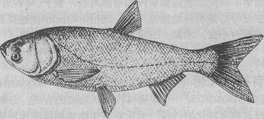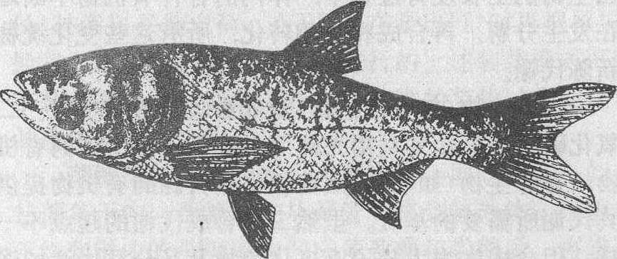 图 6 青 鱼 鲱形目鱼类的捕获量居世界渔业生产的首位,占总获量的1/4~1/3,鳕形目为第二位,占生产总量的1/5~1/4。在中国海洋渔业中占主要地位的带鱼、小黄鱼、大黄鱼、鲐鱼等,都属于鲈形目鱼类; 中国的淡水鱼资源特别丰富,约有800种,生产量在渔业中占有很大比重,其中尤以鲤形目的种类特别重要。主要经济鱼类有: ❶带鱼(Trichiurus haumela),产量居海产鱼类首位,是中上层聚群性洄游鱼类,有昼夜作垂直移动的习性; 性凶贪吃,主食毛虾和乌贼等,秋后因大群进入黄海南部越冬,在浙江沿海形成鱼汛; ❷黄鱼有小黄鱼(Pseudosciaena polyactis) 和大黄鱼(Pseudosciaena crocea)均属中国四大海鱼,是沿岸浅海区中下层的结群性鱼类; 小黄鱼的鳞大和尾柄短是区别于大黄鱼的特征; 3~5月分别在黄海、渤海和长江口产卵,常在产卵场及浙江温州外海、黄海南部等越冬地形成渔场; 大黄鱼有较强的发声能力,在索食和越冬洄游时结成大群,产卵期因分布区不同而异; ❸鲻鱼类大多栖于热带和亚热带海洋,也可进入淡水生活,最常见的是脂眼睑发达的鲻鱼(Mugil cephalus)和缺乏脂眼睑的梭鱼,鲻鱼和梭鱼主食海藻、泥中的有机物和无脊椎动物等,能适应在不同盐度的水域中生活,是发展半咸水养殖业的理想鱼种; ❹鳓鱼(Ilishaelongata)又名鲞鱼,是四大海产经济鱼类之一。游泳迅速,白天栖于水的中下层,晨昏、夜间和阴天升到水的中上层活动,以鱼类、头足类等为主要食饵; 繁殖期间向近岸洄游,通常在黎明或黄昏时出现群起浮头现象,即为产卵征兆; 主要渔期在4~7月,以浙江的产量最高,广东的曹白鲞和浙江的酒糟鲞均负盛名(图4); ❺鳕鱼(Gadus macrocephalus)是黄海北部的重要经济鱼类,栖息在50~80m的泥沙底质海区;1~2月由外海集群游向山东近海区,产卵后分散回归外海,入秋则鱼群南下,因而每年在12~2月和4~7月分别形成捕捞的冬汛及夏汛;幼鱼生长快,2龄鱼即达性成熟; ❻鲐鱼(Pneumatophoru s japonicus)是暖水性远洋结群性鱼类,每年进行季节性的远距离洄游,春夏时栖息于水的中上层,有趋光性和垂直移动现象; 主要食物是浮游甲壳动物,也食鱼类、头足类、毛颚类、多毛类等; 鲐鱼分别在黄海南部、东海和台湾北部越冬,3月离越冬场,4~5月到山东沿海和闽东台山渔场产卵,然后分散索食,入秋后离岸游返越冬场,幼鱼生长到3~4岁性成熟; ❼银鲳(Pampus argenteus) 是近海中下层的优质食用鱼类,分散栖息在潮流缓慢、水深50m左右的海区; 银鲳以水母、底栖生物和小鱼为食;5~6月,黄海的鱼群在珠江口、舟山群岛及山东海阳近海一带产卵,东海的鱼群于5月在北部海域生殖,秋季时南下至台湾海峡越冬; ❽中华鲟(Acipenser sinen-sis)是硬骨鱼类中古老类群的残余,具歪形尾、喉板、肠螺旋瓣、硬鳞和动脉圆锥内有纵列瓣膜等一系列原始特征,分布于沿海和长江流域,性成熟后由海入江产卵,现因数量锐减,已被列为国家二级保护动物(图5); ❾青鱼(Mylopharyngodon piceus)头小而尖,咽齿1行,臼齿状,偶鳍青黑色,大多生活在水的中下层,以螺、蚬、蚌等软体动物为食,生长快,个体大,是“四大家鱼”中肉质最佳的一种,主要分布在长江以南的平原地区(图6); ❿草鱼(Ctenopharyn-godon idellus),形似青鱼而头略扁宽,偶鳍灰黄色,鳞色浅,咽齿2列、呈梳状; 生活在水域的中下层和沿岸多水草区,是草食性鱼类; 由于草鱼的食料简单、价格低廉,鱼苗来源广,并兼有长势快和肉味美等优点,因而历来是淡水养殖业的主要种类: ⑾团头鲂(Megalobrama amblycephala),俗称武昌鱼,是人工养殖的重要鱼种。体较高、呈菱形,体长为体高的1.9~2.3倍,口端位,背鳍前有硬棘,腹棱不完全; 适于湖泊静水水域生长,以吃植物性饵料为主; ⑿鲢鱼(Hypophthalmichthys molitrix),眼小,位于头轴之下,鳃耙细密、联成不能分离的膜质片,腹棱从肛门前伸至胸鳍,体色银白,吃浮游生物,是淡水放养的四大家鱼之一,全国各江河、湖泊几乎都有分布(图7);