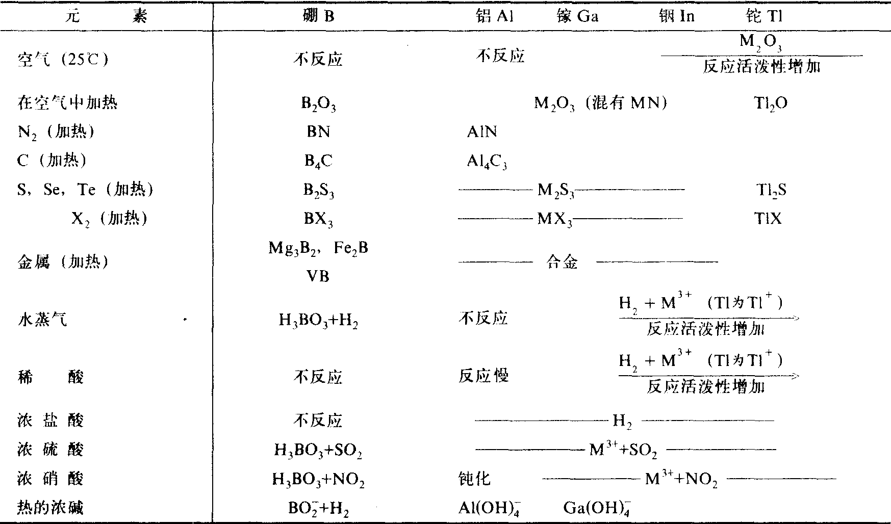 硼具有 一般非金属元素反应的性能,它有较大的电负性,能与金属形成硼化物。铝和氧化合时放出大量的热,还能将许多金属氧化物还原为单质,可用于制备一些难熔金属单质 (Cr,Mn,V等),称为铝热法。例如: 8Al+3Fe3O4=4Al2O3+9Fe 温度可高达3000 ℃。 硼族元素用途广泛。硼是核反应堆中良好的中子吸收剂。铝广泛地用做结构材料; 高纯度的镓、铟、铊可用于生产新型半导体材料。 |