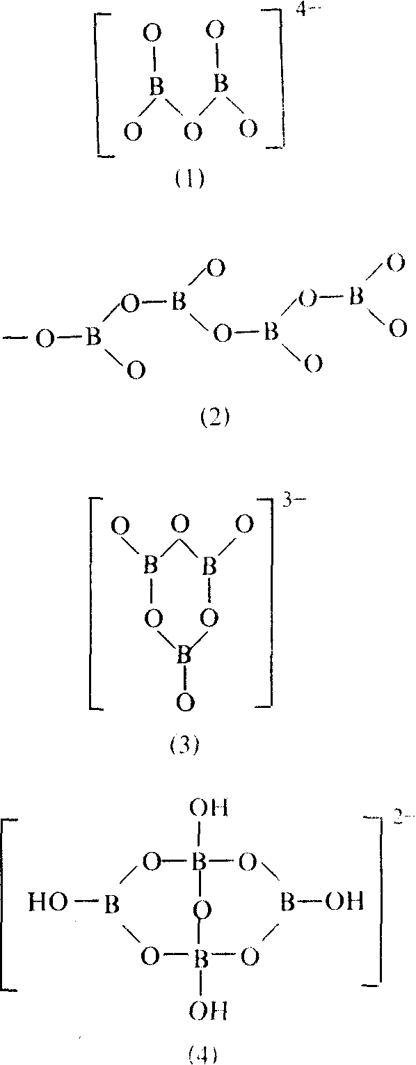 | 释义 | 硼酸盐pengsuanyan硼在自然界中,主要以硼酸盐的形式存在。硼酸盐有偏硼酸盐、正硼酸盐和多硼酸盐等。在硼酸盐中,由于B—O键的稳定性高,易聚合成长链,因此含有简单的BO3-3的盐不多。多数硼酸盐通过共用氧原子把两个以上的三氧硼或四氧硼原子团连接成链状或环状的多硼酸根离子。例如,焦硼酸钴Co2B2O5,硼镁石Mg2B2O5·H2O等都含有B2O4-5(结构见图 (1)); 偏硼酸钙Ca(BO2)2的结构是由无数B—O连成的链 (结构见图 (2)); 偏硼酸钾和偏硼酸钠等都含有环状结构的(BO2)3-3 (结构见图 (3))。
