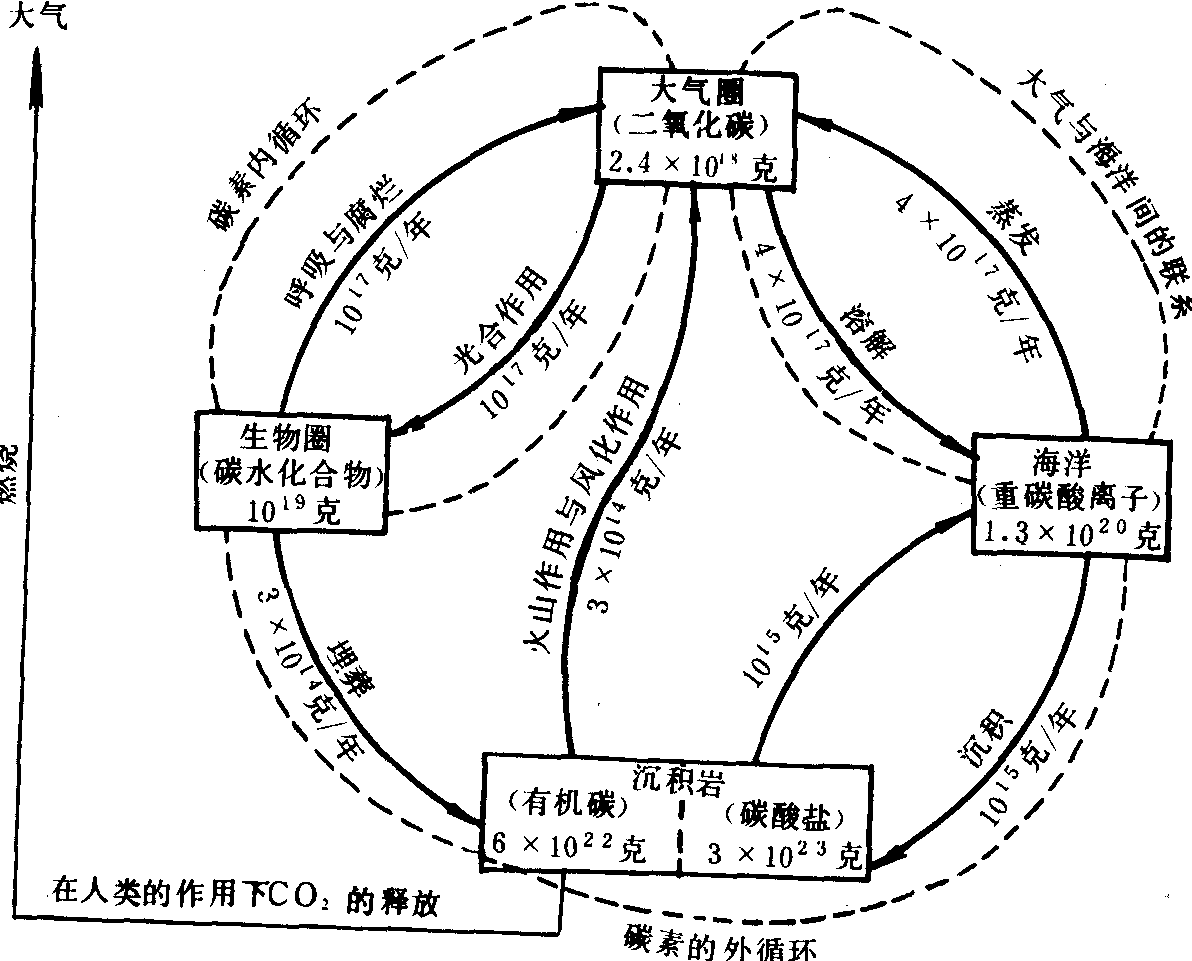 碳素循环图 从人类的利益看, 应加速碳素的内循环, 给人类创造更多的财富;控制外循环,防止因人类对石油、煤等的开发和燃烧所带来的一系列严重后果。