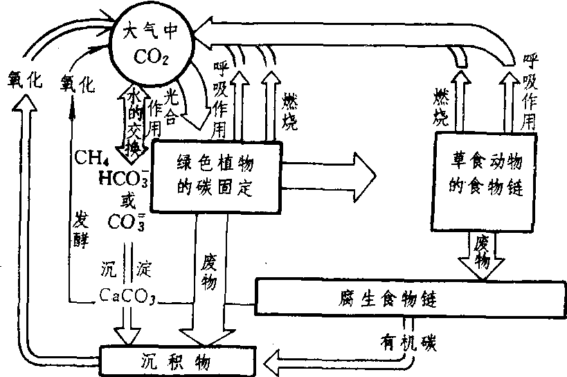碳循环tanxunhuan二氧化碳从大气储存库到生产者,再经过消费者、分解者而回到大气储存库的周而复始的过程。由于有机物干重的49%都是由碳元素组成,碳的循环就显得特别重要。生产者合成的碳水化合物一部分被自身储存和消耗,另一部分被消费者取食储存库,后者在呼吸中放出二氧化碳。生物排泄物和残体最终被分解者微生物利用,有机碳最终被氧化成二氧化碳又回到空气中去。分解者在碳素循环利用中起了关键作用。 森林火灾、燃烧薪材等过程,加快了二氧化碳返回大气储存库的过程。泥炭、煤、石油、石灰岩等生物性沉积物大约含全球总碳量的99%。碳酸岩的风化和溶解,化石燃料的燃烧,以及火山活动,把被束缚的碳释放到大气和水体储存库。自然状态下,陆地植被每年大约固定1.5×1010吨碳,而归还给大气每年约1.7×1010吨,收支大致平衡。由于人类的活动,特别是工业燃烧等原因,大气中二氧化碳浓度一直在增加,近百年来已由290ppm增加到320ppm,近十几年来增加更为迅速,已成为促进全球大气增温、臭氧层破坏的重大环境问题。更为严重的是一氧化碳污染。一氧化碳主要来源于内燃机,尤其是汽车,还有少量来自煤的燃烧。当空气中一氧化碳含量达到30ppm时,人体中就会有5%的血红蛋白的功能受到障碍。