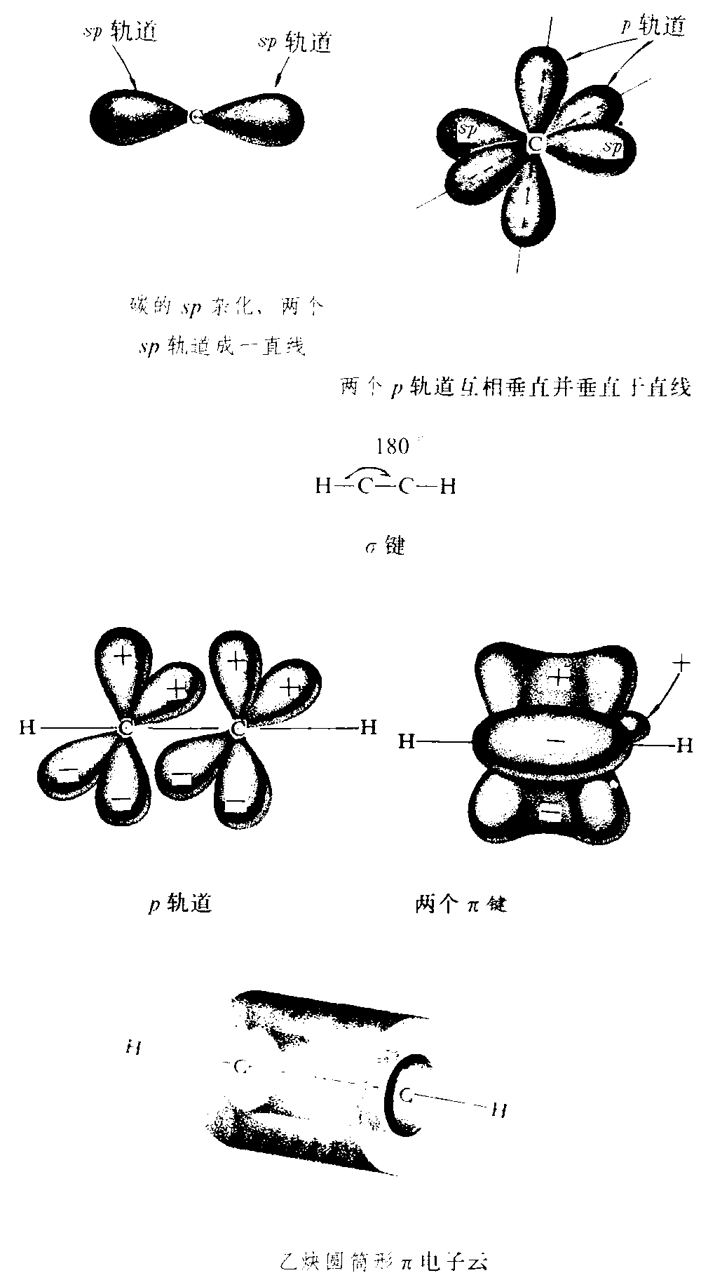 | 释义 | 碳碳叁键tantan sanjian指在两个碳核之间共享3对电子。在乙炔分子中碳核是以叁键相连的,乙炔是叁键化合物中最简单者。烃类化合物中含叁键的称为炔烃。在乙炔分子中,碳碳键长0.120nm,比乙烯、乙烷中的碳碳键都短,碳氢键长0.108nm。所有原子处在 一条直线上,CCH键角为180°,乙炔比乙烯分子更紧密。近代分子轨道理论认为乙炔碳原子为sp杂化,两个sp杂化轨道角度为180°,形成 一条直线,两个p轨道保持未杂化,每 一个sp杂化的碳与氢形成一 个σ键,与第二个碳形成一个σ键,相邻的两个平行p轨道重叠形成两个π轨道,组成叁键的3个键中两个键是π键,另一个是σ键。乙炔分子的两个π键电子云是圆筒形对称的,围绕在碳碳键轴外,π键的电子屏蔽了碳碳σ键电子,每个π键比σ键更容易破裂(见下图)。