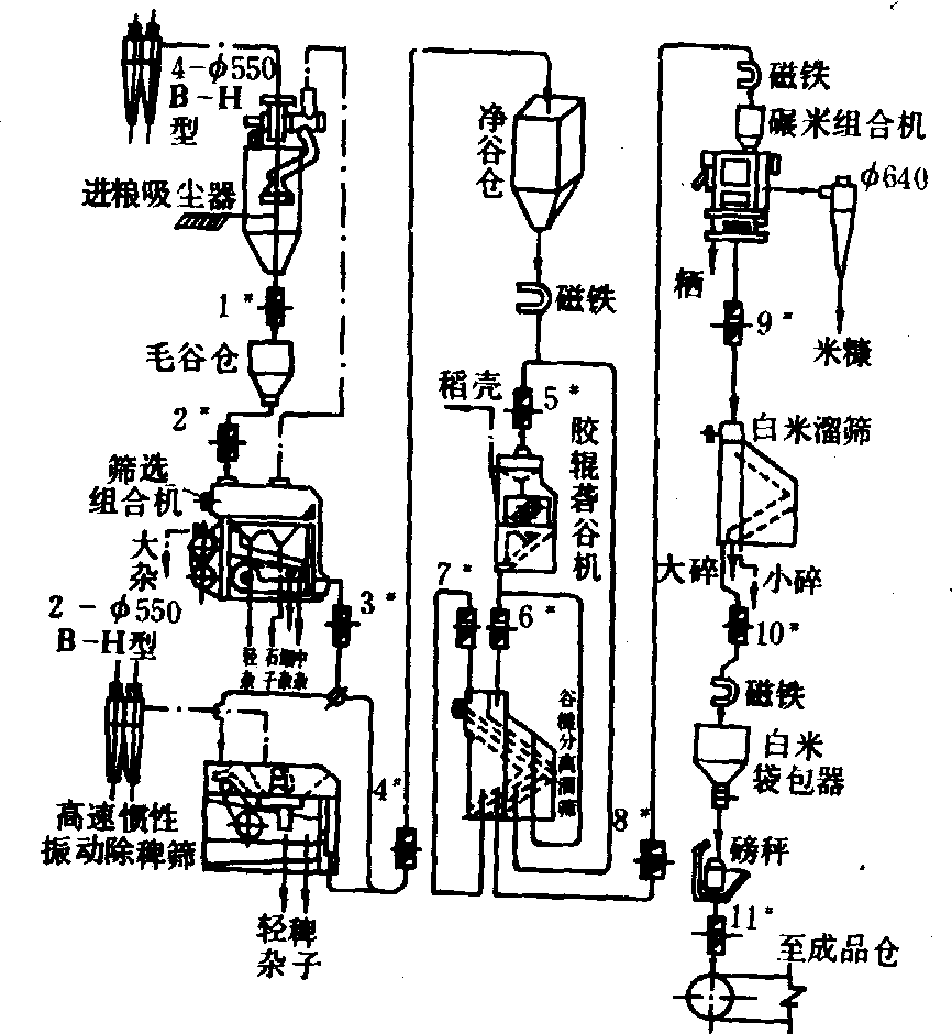 工艺流程设计内容包括:确定工艺程序、选择加工设备和物料输送设备、组合工艺流程、拟定设备技术特性、生产效率和操作规程、编制工艺流程中物料数量及质量平衡表、绘制工艺流程图及编写工艺流程设计说明书。在工艺流程设计过程中,可根据原粮和成品质量的要求,采用成熟的先进设备, 使生产过程实现机械化与连续化作业,保证原粮加工合理高效,以提高产品的纯度和出米率。同时,遵循同质合并,减少回路,尽量避免恶性循环的原则,在满足产品质量要求的前提下,尽量简化工艺流程,发挥各工序最大效率。在设备方面,宜优选国家定型的、生产效率高的和有多种功能的组合设备,并考虑其合理的配置,以发挥最大的加工效能,减少动力消耗,降低生产成本。如图所示为日产50吨标二米(早籼)成套组合设备工艺流程图。该工艺流程的工序比较完整,选用的组合设备比较成熟,流程的组合比较合理,在原粮含杂不高的条件下,能保证标二米产品的质量。