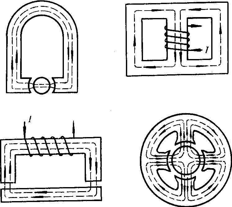 | 释义 | 磁路cilu磁感应线的主要通路。常借助于磁导率高的铁磁材料构成。当通电线圈中充入一闭合的或包含一段气隙(空气的窄缝)的铁心时,则磁感应线的绝大部分将沿铁心分布,形成磁路。若把导线与其周围的绝缘体看作并联电路,漏电流(通过绝缘体闭合的电流)可以忽略不计;而铁磁质的磁导率只比非铁磁质的磁导率大106倍左右,若把两者作为并联磁路看,则漏磁通〔通过非铁磁质(例如空气)闭合的磁感应线形成的磁通〕的比例要大的多。尽管如此,铁磁质还是把绝大部分磁感应线集中在自己内部形成磁路。一般在求铁磁质中的磁场时只须按磁路定律计算即可。铁磁质应用最多的是利用其高磁导率形成强磁场。凡是用到各种铁心的器件和设备中,例如在变压器、互感器等磁耦合器件或电动机、发电机、磁铁等设备等,都存在如何正确设计磁路的问题,包括确定磁路所用材料、磁路形状、尺寸及铁磁材料的工作点等。下图给出电工中常见的几种磁路示意图(虚线为磁力线)。