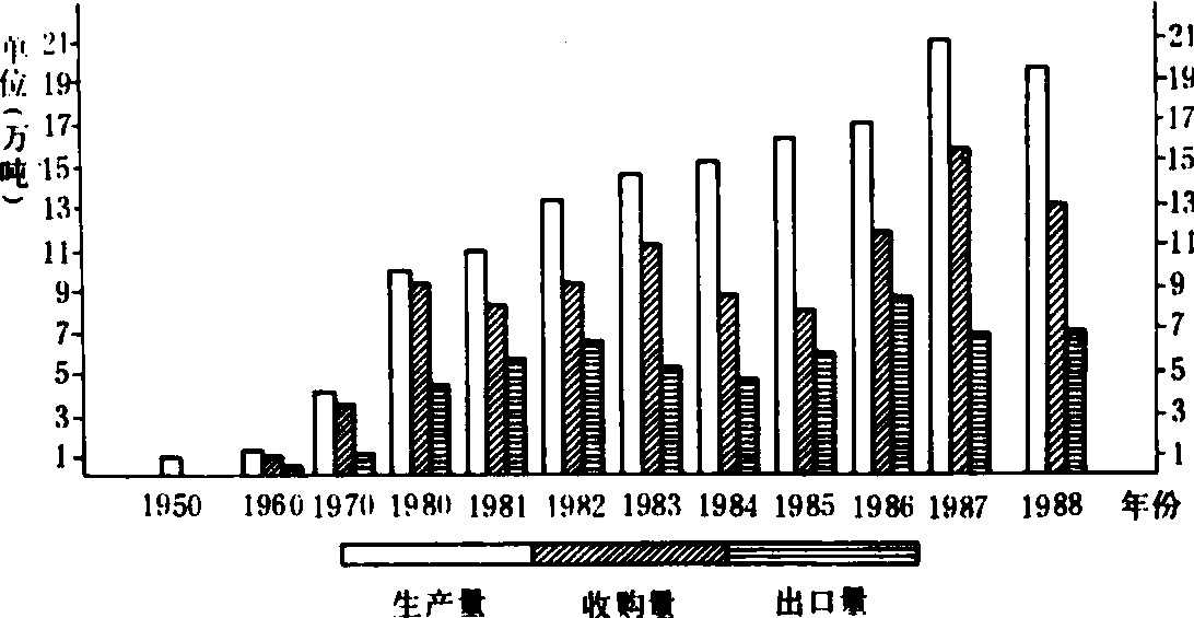 中国蜂蜜生产量,收购量和出口量 中国从1957年开始生产蜂王浆,当时由临时组织的无王群生产,工序繁杂。1959年研究推广了用加继箱的有王群生产蜂王浆技术。70年代中国开始蜂王浆出口,主要出口国家是日本、美国、意大利。中国加工制造了多种蜂王浆产品,如蜂王浆蜜、王浆口服液、人参王浆口服液、王浆麦乳晶、王浆冻干粉等,进一步促进了蜂王浆的产量。(见表) 1979~1987年中国蜂王浆产销情况