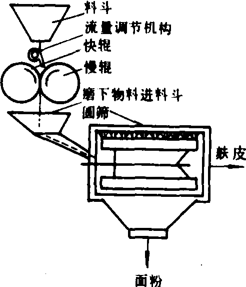 农用小型辊式磨粉机示意图 电动机与三角胶带轮传动磨粉机的快辊带轮,转速为600转/分。同时以平胶带轮传动小筛胶带轮。磨粉机的快辊通过齿轮使慢辊作相向旋转并具有2.5:1的速差,喂料辊的胶带轮由慢辊轴上的胶带轮传动,转速为200转/分,并通过离合器与喂料辊相连接。 大、中型磨粉机 由两对磨辊组成,每对磨辊有其独立的喂料和调节系统,可同时碾磨两种不同的物料。喂料与轧距调节采用电子传感液压自动控制或气压自动控制系统。有物料自流与磨膛气力吸料两种型式。磨辊直径为250毫米,长度为400、500、600和800毫米。快磨辊采用水冷却装置,以降低磨辊与轴承温度。 |