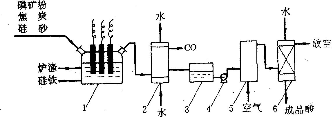 1 电弧炉 2.冷凝器 3黄磷贮槽4泵 5燃烧炉 6 吸收塔