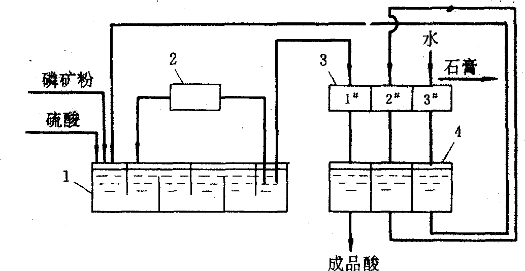 526%~30%),石膏转移到第二过滤机后用稀酸洗涤过滤,滤液返回反应槽首端,石膏转移到第三过滤机用水洗涤过滤,滤液返回第二过滤机作洗涤剂,石膏运出厂外废弃。此法工艺简单,成本低廉,但磷的回收率低,石膏因含磷量高不宜用做水泥原料。