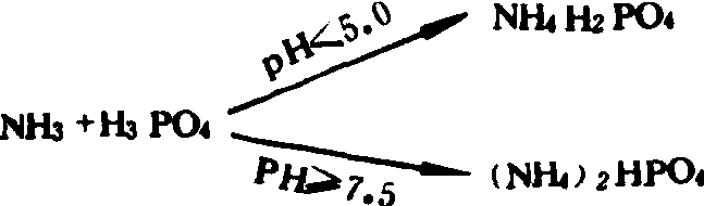 第二步:用氨中和磷酸,制成磷酸一铵及二铵时,主要通过控制参予反应的氨与磷酸分子比和溶液的pH达到。其反应为: