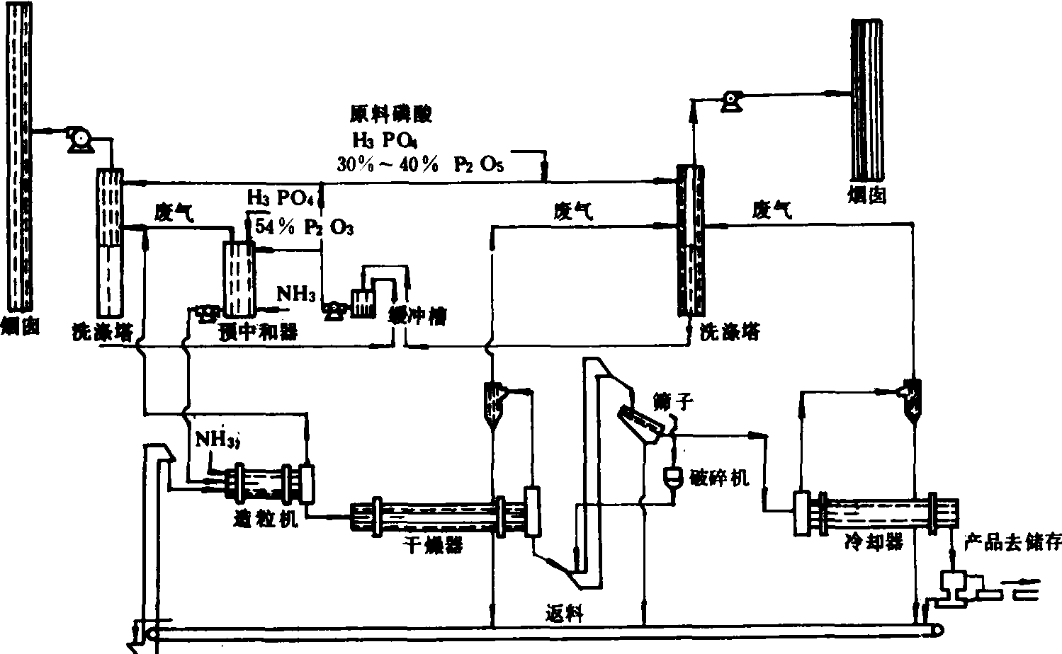 作肥料的磷酸铵常是一铵和二铵的混合物。 美国田纳西流域管理局(Tennessee Valley Au-thority,TVA)开发的磷酸二铵生产工艺较有代表性,应用较广泛。其基本流程为以含P2O530%及54%的两种浓度磷酸混合,作为原料磷酸,用氨预中和。氨与磷酸的分子比控制在1.4左右,生成的料浆继续添加氨蒸气,使其分子比在接近2的条件下喷浆造粒,然后干燥、筛分、去除返料后获得粒状产品,其流程概图如下: