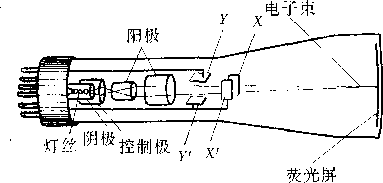 | 释义 | 示波管shipoguan用来显示和观测电信号波形的一种电子射线管。它能显示的信号频率范围很宽,从低频到高频。既能显示周期信号,也能显示非周期信号。荧光屏上显示的波形,大部分是供肉眼观察和测量用的,也可以通过照相感光等办法进行摄录。各种电、力、声、光和热等物理和化学的变化过程,均可通过适当的传感器件将其转换成为电信号,用示波管来分析研究。如图,示波管是由玻璃壳、电子枪、偏转系统和荧光屏四部分组成。玻璃管内的真空度高达10-4帕,灯丝通电后温度升高,给阴极加热,使阴极发射电子。电子经过圆筒形的控制极和阳极的小孔,形成一束很细的加速的电子束。产生电子束的这部分装置通常叫做电子枪,它包括灯丝、阴极、控制极和阳极。从电子枪射出来的电子束,打在管底的荧光屏上,形成一个小的亮斑,亮斑的大小和亮度,由加在控制极和阳极上的电压来控制。示波管采用电偏转系统,它的电偏转系统由两对相互垂直的偏转板组成,靠屏的一对偏转板称为X偏转板或水平偏转板,靠电子枪的一对偏转板称为Y偏转板或垂直偏转板。如果在X偏转板上加上随时间成线性变化的一定频率的锯齿形扫描电压,同时在Y偏转板上加上被测的电压,那么荧光屏上的亮斑在水平方向匀速移动的同时,又在垂直方向移动,于是从亮斑的位置变化就可以知道垂直极板上的电压随时间变化的情况。通常加在垂直极板上的要研究的电压是周期性变化的,示波管上显示的波形完全正确地代表了加在Y偏转板上的被研究的信号电压的波形。