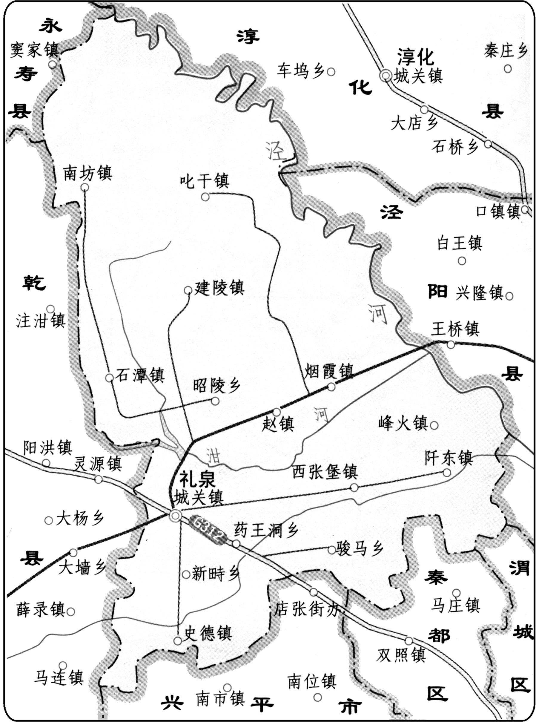 礼泉县政区图 礼泉县咸阳市辖县。位于咸阳市中部,北抵泾河,东与泾阳县隔河相望,东南至秦都区,西与兴平县相连,西到乾县,西北与永寿县为邻。南北长53公里,东西宽32公里。面积1010平方公里,其中耕地84.73万亩。地处渭河黄土台原,泾河右岸,地势西北高东南低。北部为原梁沟壑区,海拔700米以上; 南部原面平坦,海拔410—700米之间。主要山峰有五峰山、瓦庙山、亮凤楼山、西青山、朝阳山。其中五峰山最高,海拔1647米。属暖温带大陆性季风气候,年平均气温12.96℃,年积温4239℃,10月均温-1.9℃,7月均温26.7℃。日照2188小时。降水量537毫米。无霜期219天。南北气候差异较大,北部丘陵地区夏短而凉,冬长而冷。主要河流有泾河、泔河、小河、泥河4条河流。泾河从县境东北边界流过,境内流程52公里,平均流量6.2立方米/秒。泔河从西北由乾县流入县境,向东汇入泾河,境内流程30.1公里,平均流量0.2立方米/秒,流域面积687.4平方公里,占全县总面积的67.6%。小河、泥河流量均很小。全县常住人口40.57万,其中农业人口38.48万人。境内居民汉族占99%以上,还有少量的蒙、回、壮、土家等少数民族。辖城关、赵镇、史德、阡东、南坊5个镇,药王洞、裴寨、骏马、西张堡、北屯、烟霞、新畤、昭陵、烽火、建陵、东庄、叱干、相虎、北牌、石潭15个乡,633个自然村。县政府驻城关镇。因境内有北周醴泉宫,故名。这里夏商属雍州。周是京畿之地。秦置谷口邑,西汉置县。东汉建武六年(30)入池阳县。北魏始光中期分池阳置宁夷县,县治在原谷口城。西魏大统元年(535)在宁夷县置宁夷郡,将宁夷县一分为二,县南置新畤县,县北置甘泉县。北周改宁夷郡为秦郡,将新畤、甘泉两县合并为宁夷县。隋开元十八年(598)改宁夷县为醴泉县。唐武德年间,废醴泉县设温秀县和好畤县。唐贞观十年(636)在今赵镇乡一带置醴泉县。唐文明元年(684)分醴泉县西部入奉天。宋时,醴泉县治在今骏马乡旧县村。明洪武二年(1369)县治迁今址。1949年5月20日县城解放,归咸阳专员公署。1953年1月划归宝鸡专员公署。1956年9月由省直辖。1958年12月并入乾县。1961年恢复县制,重归咸阳地区。1983年咸阳地区改为咸阳市,遂由市辖。1964年经国务院批准,将醴泉的“醴”改为“礼”。境内的文物古迹以唐代为主。唐太宗李世民的昭陵,在县城北22公里处的九嵕山上,海拔1168米。陵园周长60公里,面积30万亩,已发现墓冢185座。陵墓两旁的6匹石雕骏马名扬海内外,名曰“昭陵六骏”。其中两匹1914年被盗运美国,藏于费城宾夕法尼亚大学博物馆。唐肃宗李亨的建陵,在县城北15公里的武将山上,是目前关中石雕最多、最完整的一座唐陵。李𪟟墓在县城东北18公里的烟霞新村。墓为三个相邻的大冢,象征阴山、铁山和乌德鞬山,以表彰李𪟟破突厥、薛延陀之功。另外,还有李靖、尉迟敬德、魏征等唐代大臣的墓地。该县历史名人和知名人士主要有戊戌变法运动中很有建树的帝党人物宋伯鲁;1928年渭华暴动的领导者之一王授金;礼泉县党组织创建人、县游击队司令员秋步月烈士,全国劳动模范王保京,民间歌谣艺人李登峰。境内植物资源以农作物和林木为主。农作物有小麦、玉米、棉花、油菜、蔬菜等,林木有泡桐、刺槐和苹果、梨、柿子、葡萄树等。主要树种有刺槐、杨树、桐树和果树,有防护林10多万亩,林网、渠旁和其他林30万亩,果林近14万亩,活立木蓄积量133万立方米。动物以家畜家禽为主,主要有牛、马、驴、骡、猪、羊、鸡等,其中“秦川牛”、“关中驴”最为驰名。矿藏主要有石火石,储量约96.8亿吨。还有铁矿,品位较低。草场资源19.9万亩,主要为灌木草丛类草场。全县年自产径流和过境客水19.2亿立方米,出境量为19.5069亿立方米,可控水量2748万立方米。该县是全国粮食生产基地县之一和第二批优质商品粮基地县。境内有中、小型水库7座,总库容1240万立方米;塘库126座,总库容492.7万立方米;各类渠道2200多公里;抽水站300多处;机井913眼。水利设施面积达56万亩,有效灌溉面积53万亩,水利化程度为51%。全县有大、中、小型拖拉机4700多辆,农机装备总动力13.3万马力,机耕面积达到90%。优越的水利化和机械化条件,促进了农业生产的稳步发展。1990年粮食播种面积94.47万亩,总产21万多吨,人均539.5公斤,提供商品粮5万吨,商品油菜1415吨。大家畜存栏3.09万头,猪6.62万头,羊1.25万只,家禽62.8万只,年产肉类2800吨,商品率为98%;产奶790吨。商品率为94%。该县盛产苹果。1985年“秦冠”苹果获部优产品称号,1989年“秦冠”、“红富士”苹果又获部优产品称号。1990年全县苹果面积12.25万亩,产量5万多吨,产值6000余万元。按1980年不变价计,农业总产值为1.46亿元。全县有县办企业29户,职工2200多人,以机械、建材、制药、农产品加工等行业为主,总产值1.62亿元。县水泥厂生产的425号硅酸盐水泥被评为省优产品。有乡镇企业10785户,固定资产8300多万元,总产值2.34亿元。峰火村二十世纪50年代就以科学种田,粮棉高产全国闻名,近年来村办企业也有了长足发展。袁家村是二十世纪70年代由穷变富的典型,村办企业在全省以至全国都有一定的知名度。此外,境内还有6户省、市属企业。境内公路纵横交错,除西(安)兰(州)公路穿境而过外,还有13条柏油路通往邻近各县和20个乡镇,全县通车里程总长688公里,每个乡镇通班车。共有汽车1421辆,其中载货汽车875辆,年货运