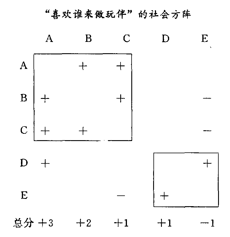 | 释义 | 社会方阵shehui fangzhen也称社会矩阵。社会心理学中用表格的形式来显示群体成员之间关系的一种方法。由美国心理学家莫雷诺首创。社会方阵是根据社会测量法的测量结果,按被试的总人数n绘制成的n阶矩阵。表内记入各成员的选择关系或排斥关系,分别记+或一。也可按照选择的强烈程度打分,如最喜欢的记+3,依次递减;最不喜欢的记-3,依次递加。表内正得分最多的是最受欢迎的人,负得分最高的是最不受欢迎的人,被选择次数最少的人则是被人群孤立的人。社会方阵表中不仅可以看出每个成员的受欢迎程度,而且可以反映每个人总的好恶态度。另外,从表中我们还可以看到一些小群体的存在(见下图)。在进行社会工作时,抓住这些小群体的核心人物将有利于工作展开,提高工作效率。社会方阵的缺点在于:对群体成员间各种相互关系的深层结构和动态无能为力,并且无法像社交图那样直观地反映出群体中人际关系的状态。