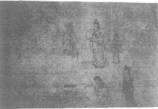 | 释义 | 祝祷升仙图壁画东汉前期。纵243厘米,横310厘米。辽宁省金县营城子前牧城驿汉墓主室北壁壁画。1931年发掘。画面左上侧有一从云雾中走来的飞仙,身披羽毛,手持树枝。一仙鹤展翅俯冲飞向仙人。画面中央是一身穿长袍、头戴方巾、执扇而立的方士,沟通着神与人。他面前有一身材魁伟、戴三山冠、蓄长髯者躬身而立,拱手似向方士请求,显然是墓主人。其身后随一童子,捧物以备奉献。画面上角一苍龙正腾跃而出,为死者升仙时驾驭。画面下部置一几,上有一奁,几周围有羽觞。墓主人的三位亲人或立或跪,在为墓主祈祷,祝早日升仙,表情极为虔诚,表现了汉代人们的思想意识。画面简洁,艺术语言概括,线条十分轻盈。