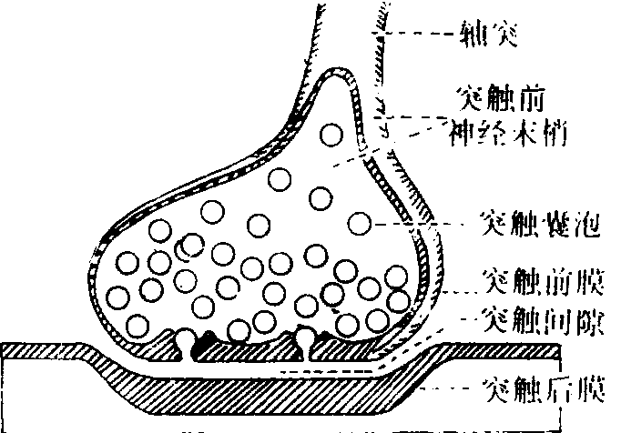| 释义 | 神经元间的信息传递兴奋在一个神经元内,例如从细胞体传导到轴突末端,是以电信号的形式进行传导的。但在神经元之间,即一个神经元兴奋引起另一个神经元兴奋,则不是这么简单,大多数情况下是要通过化学物质做中介的,因而称为“传递”。就好像400米接力跑时,前一个运动员必需将接力棒递给后一位运动员才起作用一样。为什么神经元之间的传递这么复杂?这是因为神经元之间是有一定间隙的,它们之间在结构上不是直接连接的,一个神经元的电变化一般不能直接传导到第二个神经元。神经元之间的传递必需通过一种称做“突触”(见图1.12-4)的特殊结构处。在这里,两个神经元之间的间隙(突触间隙)很小,间隙两侧的神经元膜均增厚,其中一侧称为突触前膜,另一侧为突触后膜。兴奋总是从突触前膜所在的神经元传递给突触后膜所在的神经元。因为突触前膜内有贮存化学传递物质的小泡,当该神经元的兴奋以电信号的形式传导到这里时,小泡移向突触前膜处并破裂释放到突触间隙(电信号转变为化学信号),经突触间隙弥散至突触后膜处,可与突触后膜上的受体相结合,再引起突触后膜所在的神经元出现电信号(化学信号转变为电信号),因而,兴奋经过突触传递时与在神经纤维上的传导不同,比较复杂,除了有电信号外,中间还要经过化学物质做中介。