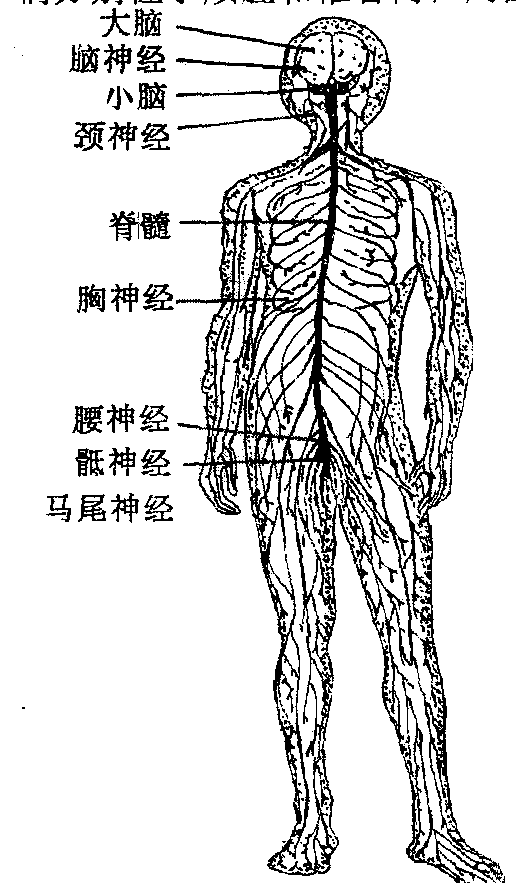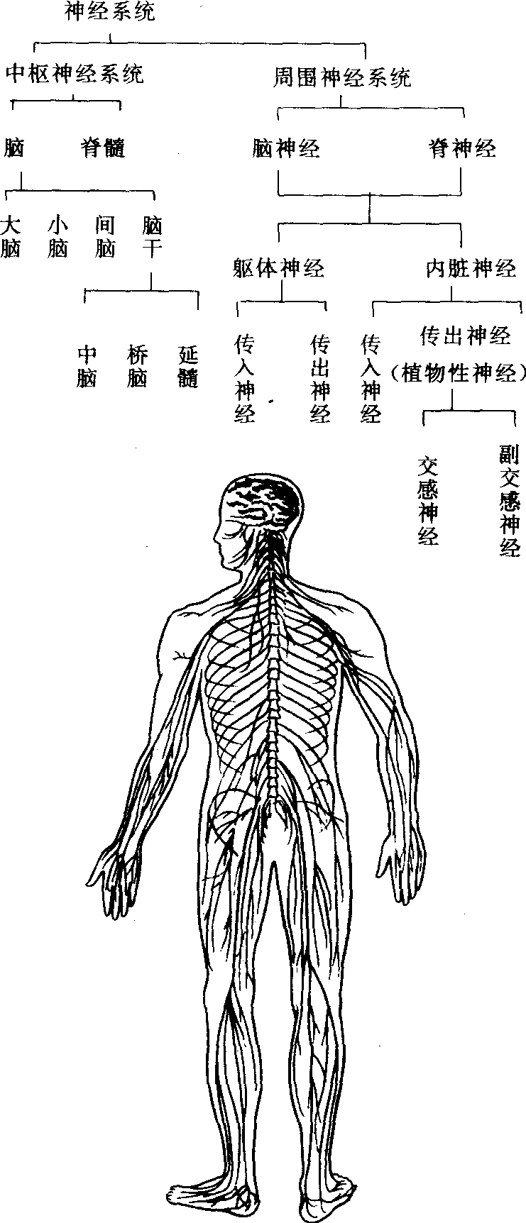 图1-27 人的神经系统 神经系统nervous system多细胞动物体内调节各器官活动、使之适应内、外环境的全部神经装置。由神经细胞(又称神经元)和神经胶质细胞组成。在低等的腔肠动物为简单的扩散神经网,扁形动物分化为脑和神经索。随着动物进化,神经系统向头部集中。高等脊椎动物的神经系统包括中枢神经系统的脑和脊髓,以及周围神经系统的脑神经、脊神经和自主神经。
