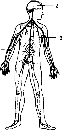 1.脊神经 2.脑 3.脊髓 人体的神经系统 脑位于颅腔内,分为脑干、小脑和大脑。脑干由延脑、桥脑、中脑、间脑构成。延脑与脊髓相接,间脑上连大脑,脑干背部与小脑连接。脑干中含有大量的神经纤维和神经核。神经核是神经元胞体的集团。绝大部分脑神经由神经核发出。在延脑和桥脑中有许多重要的神经中枢,分别调节呼吸,心血管,消化等生理功能,这些中枢若受损伤则可危及生命,俗称活命中枢。小脑有维持身体平衡,调节肌紧张,协调机体随意运动的机能,当小脑受损或有疾患时,出现行路摇晃,动作不协调不准确。大脑由左、右大脑半球组成,是中枢神经系统的最高级部分。大脑半球表面是灰质(即大脑皮质),其上有许多凹凸不平的沟和回,增大皮层面积,使其功能更为复杂。大脑皮质可划分为许多机能区。运动区和躯体感觉区,分别是肢体运动和躯体感觉的高级中枢;视区、听区分别为视觉和听觉的高级中枢;语言机能区与说话、写字、认字和理解文字等机能有关(这是人类所特有的)。人类左、右大脑半球在功能上有一定分工,绝大多数人左半球管理语言功能,右半球管理非语词性认识功能(如空间辨认,音乐欣赏等),此称为半球优势。大脑皮层下是白质,联络各区皮质及皮质与皮质下中枢。内囊是皮质与皮质下中枢联系的唯一通道,此处是脑溢血的好发部位。内囊受损时往往出现一侧运动和感觉障碍(即偏瘫,俗称半身不遂)。基底神经节位于大脑半球深部,发生病变时可出现不自主的动作(称舞蹈病)。 脊髓位于椎管内。在其横切面上,灰质位于中央,呈蝶形,白质位于外围。位于前方的灰质叫前角,发出运动神经纤维,小儿麻痹症就是此处发生病变;后方的灰质叫后角,接受感觉神经纤维传入。脊髓是中枢神经系统的低级部分。 神经系统活动的基本方式是反射,即机体接受刺激作出反应的过程。反射活动是通过反射弧完成的,包括感受器、传入神经、中枢、传出神经和效应器五个部分。脊髓中有许多低级的反射中枢(如排尿、排便和膝反射等)。反射有两种:一种是生来就有的叫非条件反射(如吮奶);另一种是在后天形成的称条件反射,条件反射是建立在非条件反射的基础上,在生活实践中逐渐完善。脑神经共12对,主要分布于头部,脊神经31对,分布于四肢和躯干。脑神经和脊神经中即有传入的感觉神经纤维,又有传出的运动神经纤维。植物性神经主要是支配内脏器官平滑肌、心肌和腺体。它分为交感神经和副交感神经。多数内脏器官,即受交感神经支配,又受副交感神经支配,两者的作用往往相拮抗(如交感神经兴奋时心跳加快,而副交感神经兴奋使心跳减慢),在中枢神经系统的调节下,两者的作用又是协调统一的。即交感神经兴奋时,副交感神经常表现为抑制。 神经系统见“人体生理学”中的“神经系统”。 神经系统由中枢神经和它发出、遍布全身的外周神经所组成。前者分脑和脊髓;后者有躯体神经系统(12对脑神经和31对脊神经,与运动、感觉有关)和植物神经系统(与呼吸、循环、体温、生殖等有关)。 神经系统神经系统人和多细胞动物体内调节各器官的活动和使机体适应内外环境变化的全部神经装置。主要由神经细胞组成。低等动物的神经系统较简单,只有一个神经网络。随着动物的进化,神经系统不断进化,向头部集中的倾向越来越明显,至人类已达到最高程度。高等动物的神经系统包括中枢神经系统的脑和脊髓以及周围神经系统的神经和神经节。神经系统在调节和控制机体活动的过程中,首先是借助于各种感受器接受内外环境的各种刺激信息,经周围神经传至脊髓和脑,通过脊髓和脑各级中枢的整合作用,再经周围神经传至各种效应器来调节和控制各系统的活动。神经系统的功能十分复杂,概括起来可分为两方面:一是使有机体内各系统成为统一的整体;二是使机体内各系统与外界环境保持相对平衡。人类神经系统的形态和功能是经过长期进化过程而获得的。由于生产劳动、语言皮层中发生了与动物不同的变化和飞跃,不仅含有与高等动物相似的各种感觉和运动中枢,而且还有语言和分析中枢。因此,人类的大脑皮层成为思维和意识活动的物质基础,使人类远远超出了一般动物和范畴。这样不仅能适应和认识客观世界,并且能主动地改造客观世界,从而使自然界更好的为人类服务。 神经系统的结构