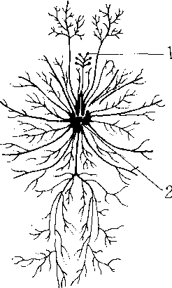 蜘蛛的神经系统 1.眼 2. 腹面的神经团 |