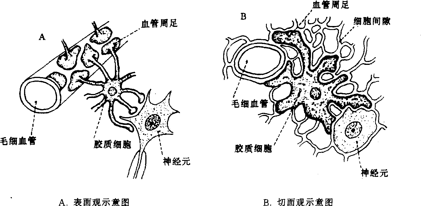 图1.12-3 胶质细胞与神经元、毛细血管之间的关系 神经胶质细胞shenjing jiaozhi xibao构成神经组织的另一大类细胞。分布在神经系统中神经元周围,交织成网,构成神经组织的网状支架。其数量比神经元的数量约多10倍,其重量超过脑总重量的一半。胶质细胞也是具有突起的细胞,但胞突无树突和轴突之分,也没有传导兴奋的能力,只是对神经元起绝缘、支持、营养和保护作用,并与神经元的再生有关。神经胶质细胞按形态和功能不同可分为星形胶质细胞、小胶质细胞、少突胶质细胞等。其中星形胶质细胞个最大,具有许多长胞突,这些胞突穿行于神经元之间,附于神经元的胞体或树突上。中枢神经系统受伤后的恢复,主要依靠星形胶质细胞的增生。少突胶质细胞参与形成神经纤维的髓鞘。小胶质细胞在病理的情况下,如脑受伤时,具有吞噬能力,参加清除溃变的神经组织和死亡的细胞。 神经胶质细胞neuroglial cell动物神经组织中起支持、营养等作用的细胞。该类细胞总称为神经胶质(见“神经胶质”)。 |