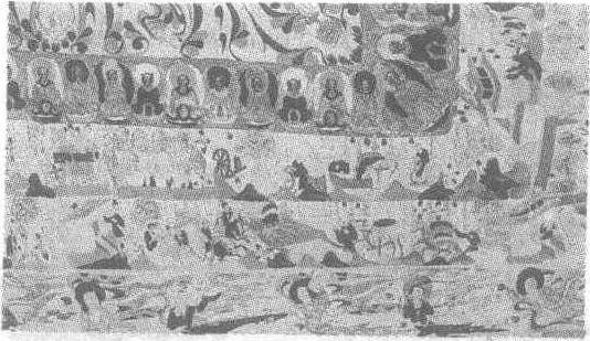 福田经变图壁画隋。纵32厘米,横345厘米。甘肃省敦煌县莫高窟第302窟窟顶人字披西侧壁画。此画据《福田经变》所绘,为莫高窟仅有的两幅之一。画描述了僧人如何广行布施,为自己积功德。画面上有打井饮畜,修造渡桥作坚牢船渡济人民,建造寺庙、佛塔,救治病人,种植果园等场景。图中僧人多赤裸上身,只穿短裤,有的在果园劳作,有的在塔上砌砖、抹灰,有的伐木,有的扛木,一派热烈而忙碌的场景,反映了当时社会生活的各种场景。每个画面多以树木相隔,树木种属已可分辨,这既是自然过渡,又增添了清幽的景色。整个画面的色泽较为淡雅悦目,较多地保留了北朝遗风,可称为隋代初期莫高窟壁画的代表作。