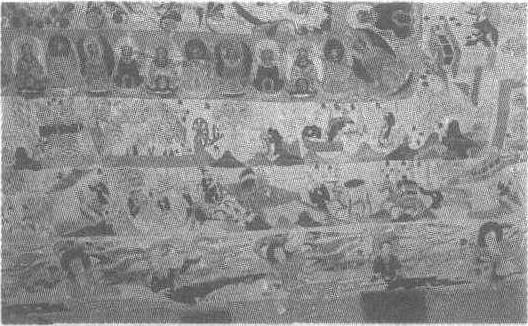 | 释义 | 福田经变(局部)壁画北周。甘肃省敦煌县莫高窟第296窟窟顶壁画。这个画面描绘的是福田经变的三个情节:凿井取水、施药治病、修桥渡人。上层左部井边有一僧人在握桔槔取水,三匹牲畜低头饮水。一只骆驼伏地而卧,边休息边等待饮水。画面右侧,一僧人捧钵,两人相互协作,给一只生病的骆驼灌药。下层画面上一座石桥,两只负重的毛驴行走在桥上,另两只毛驴跟随主人正待上桥。桥对面一骆驼向小桥缓缓走来,身后的两只毛驴在主人挥鞭驱赶下在奋力追赶。此图用笔简练,人物生动,牲畜更为逼真。座座小山玲珑精巧,树木则富于装饰情趣。整个画面生活气息浓厚,设色素雅清丽,是表现当时社会生活的重要形象资料。