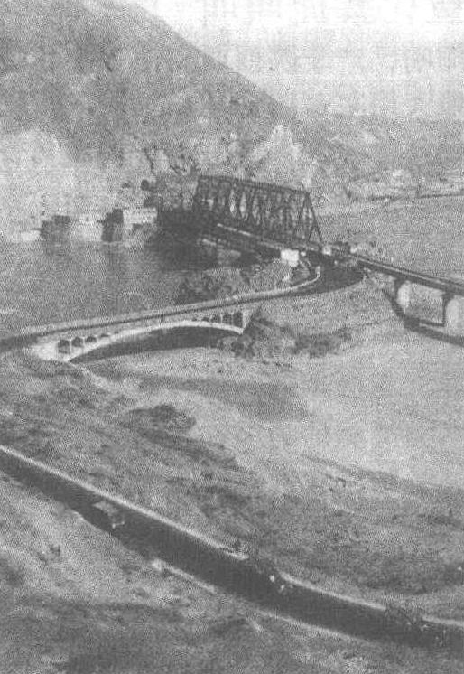 | 释义 | 禹门口黄河公路桥由一座悬索桥和一座双曲拱桥组成的连桥。位于陕西省韩城市和山西省河津市之间的禹门口渡口。1972年8月动工,1973年7月竣工通车。双曲拱桥由陕西一岸连接河心孤岛,悬索桥则由孤岛飞跨主河道连接山西省河津市一岸。双曲拱桥为单孔净跨54米。全桥共设矩形变截面钢筋混凝土拱肋6条。拱顶厚度1.24米,拱脚厚度1.44米。桥面平坡,车道净宽8.5米,两边人行道各1米。两岸桥台为明挖基础,均置于岩石上。悬索桥为单跨单链悬索结构,塔架为金属结构,间距144米。行车道宽7米,人行道左右各1米。钢塔架高17.93米。加劲桁支座间距140米,桁高3.5米,宽9.5米。钢桁两侧各由19根吊杆吊于柱主索上,每根主索由27根直径42毫米钢丝绳组成。两岸地锚采用钢筋混凝土结构。索鞍、索夹、锚头均为铸铁制造。荷载,汽车—13级,挂车—60级。