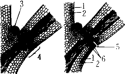 叶柄基部纵切 a. 离区形成 b. 离层和保护层产生 1.表皮 2. 周皮 3.腋芽 4. 离区 5.离层 6.保护层 |