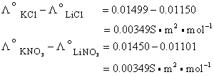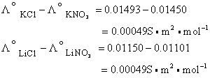由两种不同的负离子和相同的任一种正离子所组成的两种盐,其极限摩尔电导率之差亦为一定值。例如: