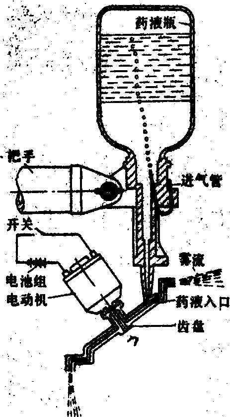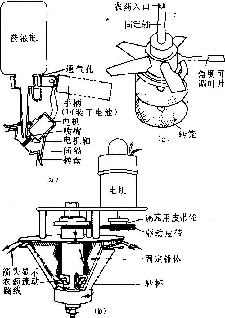 图2 背负式机动离心喷雾机 离心喷雾机centrifugal sprayers利用离心喷头高速旋转时的离心力,将药液分散或雾滴的喷雾器械。(见彩图71)