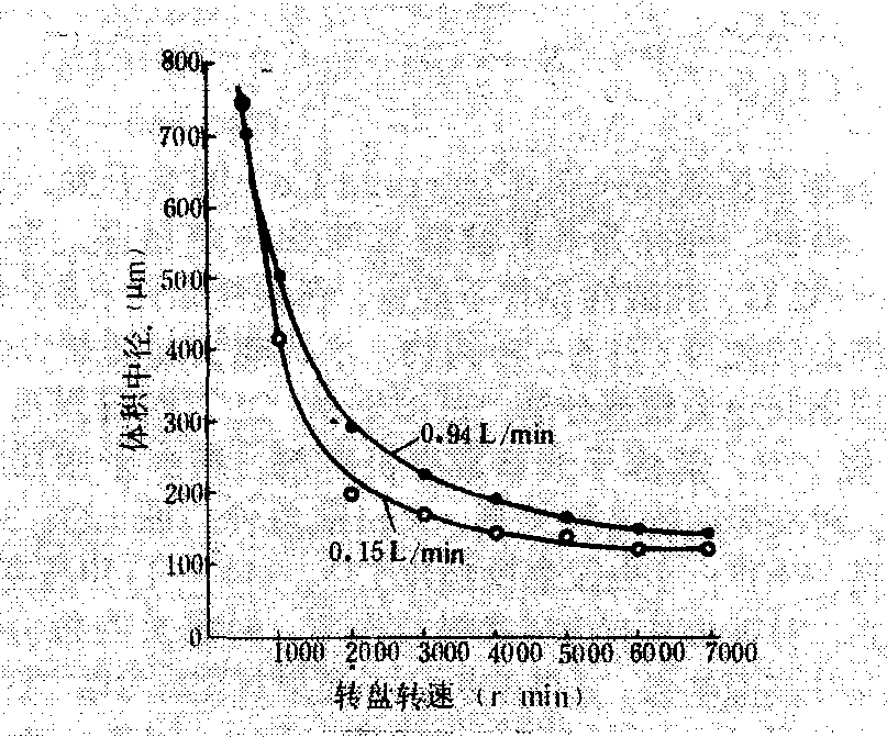 图1 离心喷雾机及离心喷头类型 a.离心喷雾机结构图及转盘式离心喷头(据G.A.Mathews); b.转杯式离心喷头(据Geoff Behncken); c.转笼式高心喷头(据Geoff Behneken) 不论是转盘式或转杯式,其圆周外缘都有一圈相当数量的尖齿。当药液从药箱经流量调节器和喷嘴流至旋转部件的中心部位后,在旋转部件离心力作用下,药液分布到转盘周边并沿外缘齿尖甩出,形成细小雾滴。为方便起见,以下统用转盘来代表各种形式的旋转部件。 离心喷雾机按动力来源及携带状况可分为手持电动式、背负机动式和拖拉机牵引或悬挂式; 根据是否有辅助气流输送雾滴又可分为非风送式和风送式两大类,前者产生的雾滴靠自然风输送,其转盘多由电机驱动。例如手持电动离心喷雾机就属于此类。后者则借助风机产生的高速气流驱动叶片旋转,带动转盘转动并辅助输送雾滴,背负机动离心喷雾机和悬挂离心喷雾机属于此类。 特点 可概括为以下四点: ❶药液流量范围适当时,离心喷头能产生大小较一致的均匀雾滴,有较窄的雾滴谱。 ❷改变离心喷头旋转部件的转速,即可改变雾滴直径。在进行控滴喷雾时,离心喷雾机是目前唯一能用于生产的一种控滴喷雾机。为此,有些离心喷头装有调速电机,以便针对不同的防治要求,选择转速,产生能取得最佳防治效果的雾滴粒径。 ❸在离心喷头高转速条件下,能产生均匀的细小雾滴,在作超低容量喷雾(施药液量在4.5升/公顷以下)时,能保证有效雾滴覆盖密度,既省水又可提高生产率。在干旱、缺水或山地使用尤为合适。 ❹能喷施粘度较大的农药,例如油剂农药,而液力式喷头不能胜任。 雾滴直径影响因素 影响雾滴直径的因素主要有转盘转速、转盘直径、流量大小和药液的物理性质等。❶雾滴直径随转盘转速的升高而变小。但当转速高达一定值后,对雾滴直径的影响就减弱(图2)。