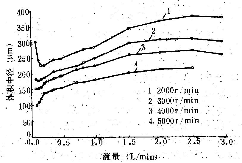 图2 两种流量情况下转盘转速与雾滴体积中径间的关系 (据L.E.Bode) ❷转盘直径越大,产生的雾滴直径越小。 ❸雾滴直径一般是随流量加大而变大,且雾滴谱也随之变宽。在低转速时,流量减至很小时会有雾滴直径反而变大的现象。低转速时流量对雾滴直径的影响关系较之高转速时为大。在各种转速下,都有相应的流量对雾滴直径影响较小的“变化缓慢区”,可利用这一区段改变流量,以满足不同喷量的要求,又不致改变防治所需的最佳粒径范围(图3)。 ❹表面张力大时,雾滴直径大、粘度大时,雾滴大小的均匀性差。如果在药液中加有一定量的湿润剂,能产生细而均匀的雾滴,改善雾化质量。 使用 离心喷雾机随喷施容量不同,其喷施方法也不同。❶超低容量喷雾。离心喷雾机作超低容量喷雾时,转盘转速约为7000~15000转/分,此时的雾滴直径大部分为40~70微米,应采用飘移累积性喷雾方法。进行飘移累积性喷雾时,喷头应高于作物顶端0.5~1米,以保证雾滴随风分散均匀,并有一定喷幅。因雾滴小,较易蒸发且药液浓度大,应使用不易挥发的油剂农药或经专门配制,加有水溶性抑制水分蒸发剂的水剂农药,严禁使用剧毒农药。作业前
