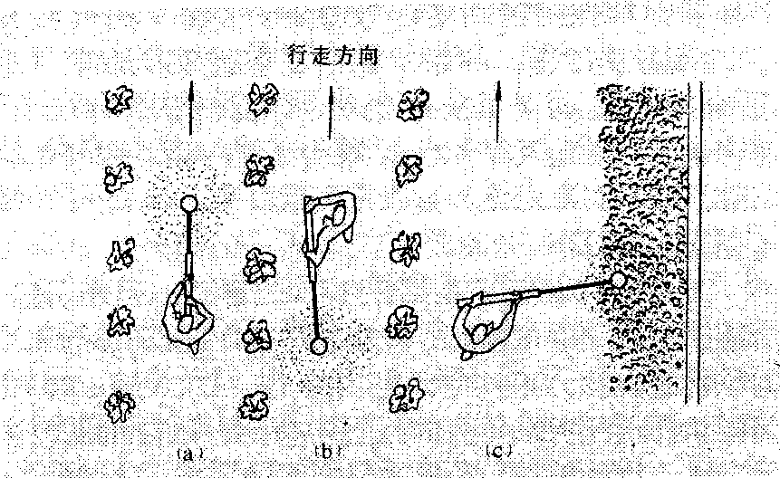 图3 不同转盘转速情况下流量变化时雾滴体积中径的变化关系图 (据R.G.Derksen) 要根据飘移累积的有效雾滴覆盖密度实测有效喷幅(见飘移喷雾法)后,再确定行进速度。作业时,为防止操作者受到药液雾滴的污染,行进方向与风向之间的夹角应大于45°(90°最理想),行进路线及喷头位置都应考虑使雾滴远离操作者,作业中要随时注意风向和风速的变化,以便根据风向来改变喷向,风太大时应停喷,以防人身中毒和影响作业质量。手持电动离心喷雾机因靠自然风力运送、分散雾滴,作业应在自然风力为 1~5米/秒(1 ~3级风)条件下进行,且要随时注意转盘转速。当因电池电压降低而转盘转速严重下降时,应立即停止喷药。❷低容量喷施除草剂。离心喷雾机应作针对性喷雾法,为防止药剂飘失而引起邻近地块敏感作物发生药害。要求雾滴直径较大,转盘转速可采用2000~4000转/分,使产生的大部分雾滴直径为100~300微米。作业时,喷头离杂草几厘米高。以手持电动离心喷雾机为例,喷头可有下列几种位置(图4)。