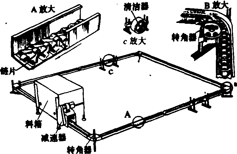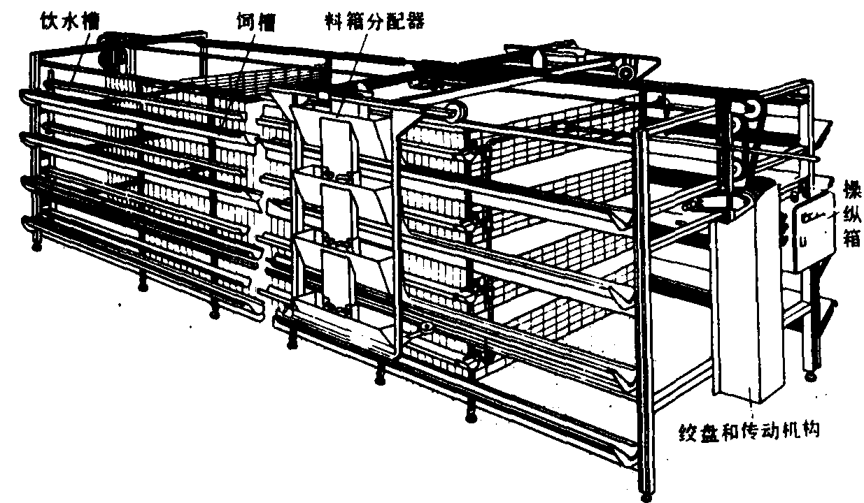 图1 平养链片式喂料机 螺旋弹簧式喂料机 主要用于平养。它由料箱、料管、螺旋弹簧、盘简式饲槽、减速电机、控制开关和悬吊装置等组成。工作时,料箱饲料由于旋转的螺旋弹簧的推移而沿料管轴线运动,通过料管上的孔落入饲槽。在最末饲槽的筒状内壁装有控制开关,利用饲料对其压力来控制电机工作或停止。螺旋弹簧钢丝的断面为3×8毫米,螺旋外径45毫米,螺距45~60毫米;工作转速150~380转/分,电机功率0.25~0.56千瓦;最远送料长度150米,送料量150~400千克/小时。盘筒式饲槽多为塑料制品,由锥形筒和食盘组成,通过调节螺栓改变二者的间隙,即可改变从锥形筒流入饲盘的饲料量。由于喂料机悬吊于禽舍,故可进行升降和调节饲槽高度。螺旋弹簧式喂料机饲料不易污染,能进行限量喂饲,因速比较小而传动机构较简单,但喂料长度较小,工作时有一定噪音。 索盘式喂料机 常用于平养肉用仔鸡和火鸡,有时也用于笼养。它由料箱、输料管、索盘、转角器、落料管、饲槽、减速器、电动机等组成。索盘为在钢丝绳上等距离压注的圆形塑料盘,并由联接器将钢丝绳两端接在一起。索盘在驱动轮带动下,沿料箱、输料管、转角器作环形运动,从而使饲料充满料管,并经落料管进入盘筒式饲槽。索盘的钢丝绳直径为5~7毫米,索盘直径为35~50毫米,盘间距50~100毫米,索盘线速度25~35米/分,输料生产率350~700千克/小时,最大送料长度可达500米,并可沿不同平面和不同方向输送。功率1.1~1.8千瓦。用于笼养时在长条形饲槽底部设输料管,输料管沿其轴线开有长槽或孔,饲料可由此而流入饲槽。索盘式喂料机工作长度大,输送速度高,无噪音,可以向任意方向转弯,但要求工作可靠,否则因索盘在管内检修不便。 缆车式喂料机 仅用于笼养。它由料箱、机架、牵引绳、绞盘、电动机和传动机构等组成(图2)。缆车可支撑在笼组上部或下部,也可将各层料箱分别支持在各层饲槽上。对于叠层式笼养,导轨常位于笼组的上部,而半阶梯式和阶梯式笼养常采用分层支撑,可不设专用导轨。缆车式喂料机应有控制排料量和排料均匀度的装置。一般是在料箱下部设强制排料器,或在料箱的出料口处设可调刮板和浮动料筒,半机械化养禽场常采用地面移动式喂料机,由动力或人力驱动,在向前移动的同时,向两侧或一侧笼组饲槽分配饲料。缆车式喂料机结构简单,设备费用低,但自动化程度往往较低。