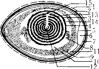 1.胶护膜 2. 蛋壳 3. 蛋黄膜 4. 系带层浓蛋白 5. 内壳膜 6. 气室 7. 外壳膜 8. 系带 9. 浓蛋白 10. 内稀蛋白 11. 外稀蛋白 12. 蛋黄心 13.深色蛋黄 14.浅色蛋黄 15.胚珠或胚盘
