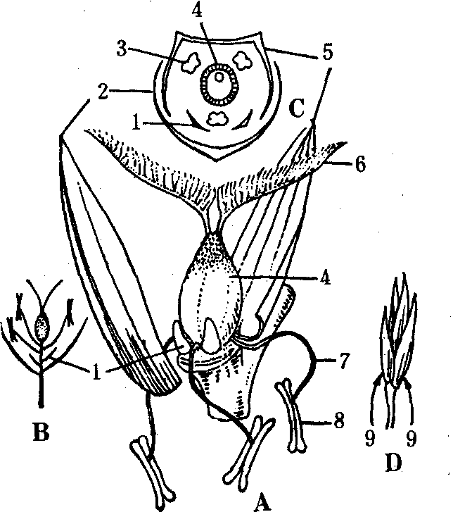 禾本科Poaceae; Gramineae单子叶植物,隶属莎草目。约620余属,10 000多种,分布全世界,以季雨热带和北温带半干旱地区最丰富,在这些地区形成辽阔的草原。中国约190余属,1200余种,全国各地均有分布。通常分2亚科: 竹亚科(Bambu-soideae),秆木质,主秆叶与具短柄的普通叶明显不同; 禾亚科(Agrostidoideae),秆通常草质,主秆上的普通叶无叶柄。也有分3个亚科的: 竹亚科、稻亚科(Oryzoideae)或早熟禾亚科(Pooideae),小穗1至多花,两侧压扁,脱节于颖之上,小穗轴常延伸; 黍亚科(Panicoideae),小穗2花,下部花常不育,背压扁,多脱节于颖之下,小穗轴不延伸。或有分6个亚科的: 竹亚科、稻亚科,小穗仅1花结实,颖退化,脱节于颖之上,小穗轴常延伸,多为水生草本; 芦竹亚科(Arundioideae),小穗2至数花结实,2颖或其1枚常明显,稍两侧压扁,脱节于颖之上,小穗轴常延伸,成熟花的外稃有3或1条脉,植物体高大,中型或小型; 画眉草亚科(Eragrostioideae),小穗1至多花结实,2颖或其中1枚明显,常明显两侧压扁,脱节于颖之上,小穗轴常延伸,成熟花的外稃有3或1条脉,植物体中型或小型; 早熟禾亚科,小穗1至多花结实,2颖或其中1枚常明显,脱节于颖之上,小穗轴常延伸,成熟花的外稃有5至多条脉,中生草本,以及黍亚科。 禾本科Hebenke被子植物门。单子叶植物纲的一个科。被子植物五大科之一,约600属,6 000种以上,广泛分布于全世界。我国193属,约1 200种。通常为草本,除竹类以外称禾草,只竹类为木本。茎特称为秆,圆形,有明显的节和节间,节间通常中空(玉米、高粱、甘蔗实心)。叶二列互生,分叶片、叶舌和叶鞘三部分,有时具叶耳(如大麦),叶脉平行。小穗是构成花序的基本单位,由小穗再集成总状、穗状、伞房或圆锥花序。每小穗由小穗轴、2个颖片和1至多朵小花组成。小花由外稃1片、内稃1片、鳞被(浆片)2片,雄蕊3枚和1枚2个合生心皮雌蕊组成,具2条羽毛状柱头,子房1室,内含1胚珠。颖果,果皮与种皮结合,极少为胞果、坚果或浆果;种子胚小,胚乳丰富。本科通常分为2个亚科,即竹亚科和禾亚科。竹亚科:为木本,叶片具短柄,花具3片鳞被和6枚雄蕊,是本科中较为原始类型。禾亚科:为草本,叶片无柄,2枚鳞被和3枚雄蕊。是本科较进化类型,种类最多,经济意义最大。现在对禾本科有人分成3亚科,5亚科或6亚科。本科经济意义重大,有多种为重要粮食作物,如水稻、小麦、玉米、高粱、大麦、黑麦、裸麦、莜麦、谷、黍稷等。甘蔗是重要糖料。雀麦、鸭茅、梯牧草、鹅观草、羊草、冰草、披碱草等多种为重要牧草。香茅和枫茅可提取芳香油。薏苡又称药玉米籽粒可食用又可入药、酿酒。野牛草、狗牙根、早熟禾、剪股颖等多种可作草皮。 禾本科grass family; Gramineae单子叶植物,一年生、二年生或多年生草本,也有木本(竹类)。x=2~23。地下茎有或无。地上茎称秆,中空有节,很少实心。单叶互生,叶由叶片和叶鞘两部分组成(竹类中称箨叶和箨鞘);叶脉平行,叶鞘包秆,一侧开裂,少有闭合;叶片、叶鞘交接处有叶舌,两旁有叶耳(竹类称箨舌、箨耳)。花序由小穗排列组成,有穗状、总状、圆锥状等;小穗含花1至多朵,2行排列于小穗轴上,基部常有2枚颖(苞片);花两性、单性或中性,小形,为外稃和内稃所包被;外稃和内稃之内有2或3(很少有6或无)浆片(鳞被);雄蕊通常3,少1、2、4或6;子房1室,1胚珠,花柱2,少1或3,柱头羽毛状。颖果,含大量淀粉质胚乳。稀有囊果、浆果或坚果。本科约660余属,约1万种,分布于全世界。中国有225属,约1 200种,全国皆产。传统分成2亚科,即竹亚科(Bambusoideae)和禾亚科(Agrostidoideae),也有分成3亚科、5亚科和7亚科等。是种子植物中大科之一,具有极重要的经济价值。其中有粮食作物,如水稻、小麦、大麦、粟、高粱、玉米等;主要制糖原料有甘蔗;作蔬菜食用的有菰和竹类的幼笋等;可作药用的有芦苇、白茅、薏苡(Coix lacryma-jobi L.)、淡竹叶、牛筋草和一些竹类;可作牧草的有鹅冠草属 (Roegneria)、雀麦属 (Bromus) 、黑麦草属(Lolium)、燕麦属(Avena)、鸭茅属(Dactylis)、羊茅属(Festuca)等;可供建筑、工业用材和造纸的有各种竹类、芦竹、荻和芦苇等;用以固堤防沙和水土保持的有大米草、结缕草、狗牙根等;许多竹类也有很高的观赏价值;此外,禾本科中也有一些是有毒植物,如毒麦、醉马草;农田杂草,如稗、看麦娘、马唐、早熟禾和狗尾草等。 禾本科单子叶植物纲莎草目植物。多为草本,少数为木本。单叶互生,排成2列。花2性,少为单性。雄蕊通常3枚,少数1~2枚或6枚。雌蕊1枚。子房1室上位,内有1胚珠。颖果。本科约有600余属,6000多种。中国约有190属,800多种。 |