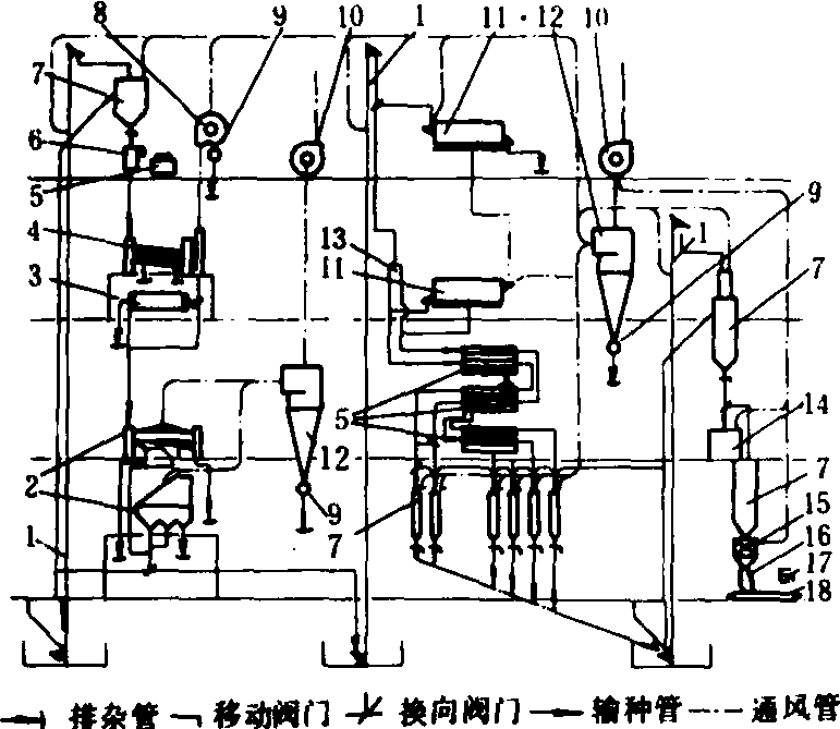 1.斗式提升机; 2.重力式精选机; 3.窝眼筒;4.筛式或风筛式清选机; 5.空气压缩机; 6.流量自动控制器;7.种子贮存箱; 8.吸风室; 9.闭风器;10.吸风机;11.圆筒筛; 12.旋风除尘器; 13.分流器;14.拌药机;15.自动秤; 16.麻袋; 17.缝袋机; 18.带式输送机