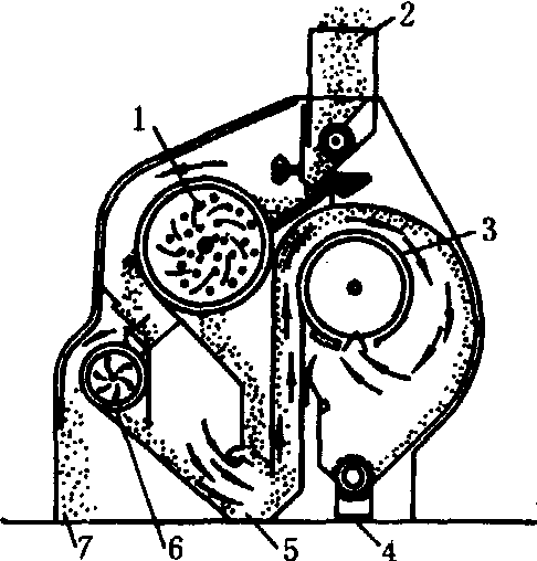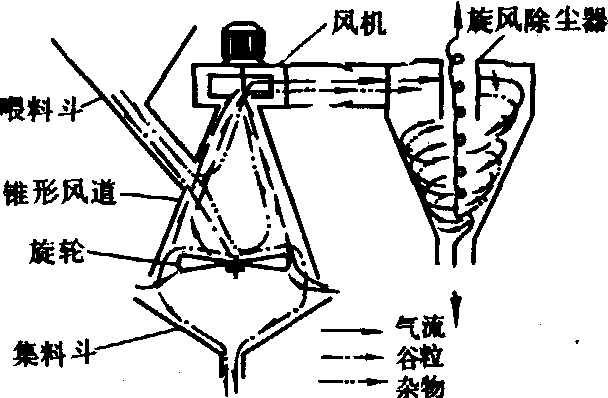 图1 鼠笼式转筒筛 1.上转筒筛;2.进料装置;3.沉降室;4.轻杂物出口;5.种子出口;6.下转筒筛;7.大杂物出口 旋轮式清选机是利用物料各自在气流中飘浮速度不同而进行分选(图2)。由于采用了旋轮,可克服短茎杆和轻的种子长轴处于铅垂位置时难于飘起,影响分离效果的缺点。工作时,物料进入锥形风道下部的叶轮中部,这时上部风机产生的气流,一方面在物料下落过程中吸走部分轻杂质,另一方面较强的气流使叶轮旋转,落在叶轮中部的物料,在离心力作用下均匀松散作径向运动,并使短茎杆处于横卧位置,增加迎风面积,使其分离,而种子落向集料斗。