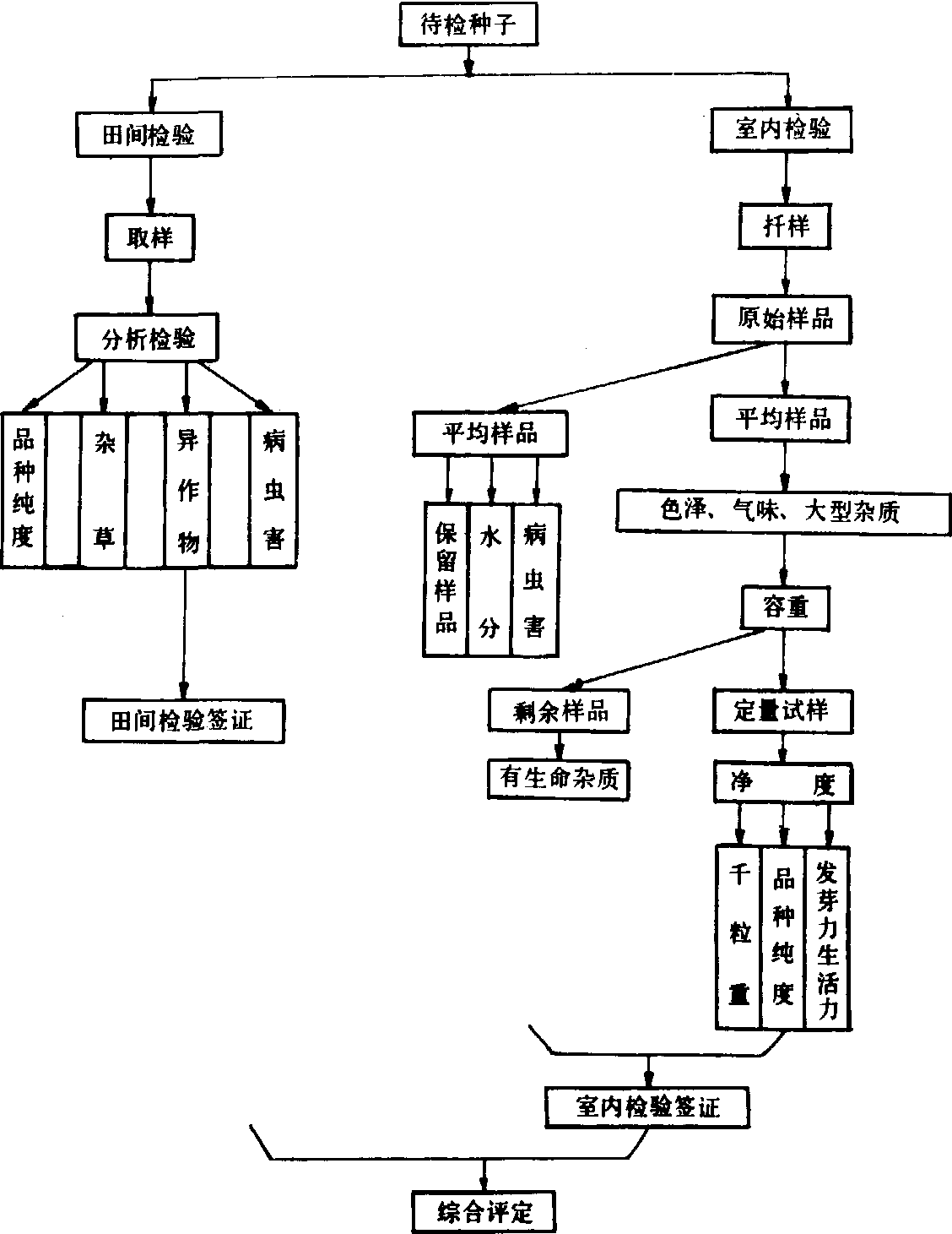种子检验程序图 田间检验在待检种子试种田块中进行。植株样本一般按单一对角线、交叉对角线或棋盘式多点法取得。原种检验取样数应比生产用种增加。室内检验的种子样品多用适于不同作物、不同堆装方式和储运条件的相应扦样器完成。品种品质检验 是指对种子真实性和品种纯度的测定。首先查明待检种子与所提供的种、变种、品种名称是否一致; 然后检验品种混杂程度。品种纯度用本品种种子数 (或植株数)占供试样品的百分率表示。检验方法以田间检验为主,田间与室内密切结合。纯度检验要以品种稳定的重要质量性状为主要依据,同时与该品种标准对照进行比较,明确其数量性状的差异。必要时也可在人工控制光照、温度、湿度和养分的环境中进行。检验要在营养生长与生殖生长的全过程中分次进行,但以品种主要性状充分表现的产品器官商品成熟期为主。田间检验除测定品种纯度外,还应重视留种地、制种地隔离条件、亲本配置与花期相遇情况等是否符合技术要求。室内检测可用已知的该品种典型种子与供检样品作形态学和解剖学的比较。 同时,蔬菜不同种、变种及品种间种子生理生化的某些差异,常可作为种子鉴定的依据。芸薹属不同蔬菜种子对氢氧化钠溶液就有不同的颜色反应; 豆类、瓜类不同种的种子对紫外光会产生不同颜色的荧光或磷光反应。此外,有些苗期标志性状明显的品种,也可通过发芽试验或苗期观察检验其纯度。 播种品质检验 是指对种子净度、千粒重、发芽率与发芽势、以及含水量等项目的测定。❶净度: 以完好种子占供检样品重量的百分率表示。 ❷千粒重:为1 000粒风干种子的重量。在净度检验后,用完好种子测定。实测千粒重因种子含水率而有差异,为了便于比较,可换算为规定水分千粒重或绝对千粒重。公式如下: 规定水分千粒重=实测千粒重