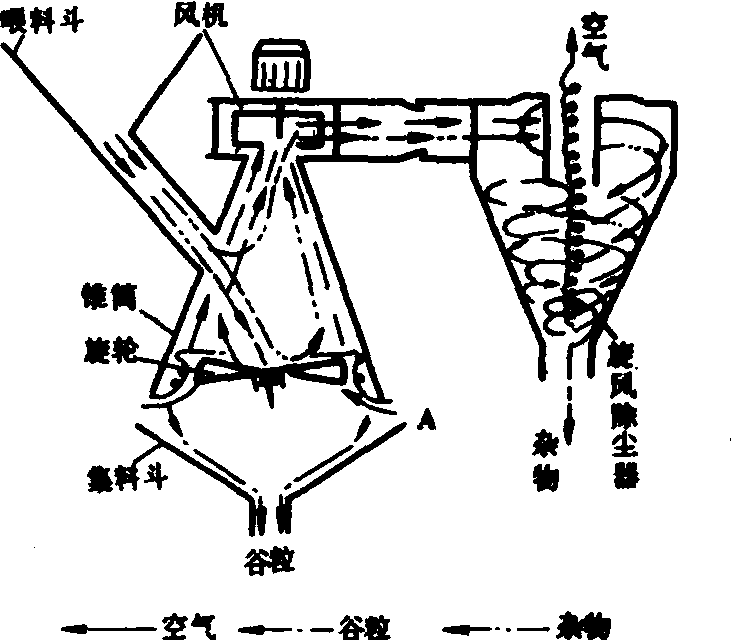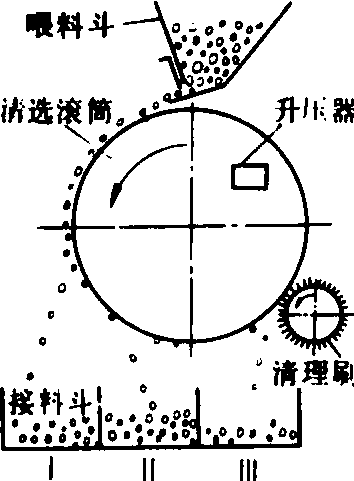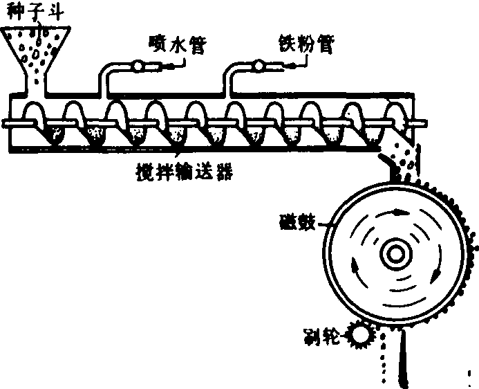 图1 旋轮式气流清选机 风筛式清选机 气流与筛片共同作用的清选机。它有一层或多层筛架,装有筛孔形状和尺寸不同的筛片,长孔筛按厚度、圆孔筛按宽度的差异清除杂质和对种子分级。在第一片筛子前和最后一片筛子后面,有垂直的吸气道,当种子物料顺气道下落或流经该气道下方时,其中的轻杂质和瘪粒种子即被吸走,随后降落在沉积室中,有的机器只在第一筛前设置一个吸气道,筛子作往复振动,一般振幅5~20毫米,频率200~600次/分,振幅大时频率低。除高频振动筛外,都要配置清筛机构清除堵孔现象,常用的有撞击式、刷式和橡胶球式三种,更换不同孔型和孔径的筛片以及调节气流速度可以适应多种作物种子的清选。有的筛片做成波纹式或带沉孔,有利细小物料通过,可提高单位筛面生产率40%以上。 窝眼式清选机 工作面上匀布凹穴(窝眼)的一种按长度去杂或分选的机具。按结构的不同分有窝眼筒和窝眼盘两种型式,前者是内表面带窝眼的滚筒,种子物料从一端喂入,当滚筒以30~50转/分的速度旋转时,一方面翻动物料,一方面将落入窝眼的短小物料带到较高处,落入到安装在筒内与轴线平行的卸料槽中,靠槽的振动或槽内的螺旋输送器推出机外。滚筒轴与水平面有一微小倾角(0°~3°),长物料在筒内不断地被带到一定高度又滑下,逐步移送到另一端排出,根据作物品种与种子含杂情况可置换不同窝眼尺寸的滚筒。在同一滚筒前后两段内表面加工成窝眼大小不同的双作用窝眼筒,结构虽然简单,但物料传送复杂,且影响效率,所以一般常用2~6个单独的窝眼筒组成窝眼筒清选机组。窝眼盘是一组以一定间隔安装在水平转轴上的圆盘,盘的两平面上均有许多窝眼。圆盘在装有种子物料的槽内转动时,短小物料落入窝眼,并随窝眼盘继续旋转到窝眼槽口向下时,落入卸料槽中。从喂料端起按窝眼大小顺序排列成组圆盘,可达到按长度多级分选的目的。把窝眼式和风筛式组合成一体即为复式种子清选机。 重力式清选机 根据种子重力大小进行分选的机械。由于向该机送选的种子已经过风筛选,尺寸基本一致,实际是按种子密度或比重大小分选,故又称比重式清选机。它由倾斜振动分级台、空气室、风机、喂料、卸料、驱动和调节机构等组成。振动分级台面托住种子振动,使种子在垂直平面内作上轻下重的自然分层,风机的气流自下而上穿过台面,加强分层作用,并使种子处于半悬浮状态,类似流体。上层密度小的种子,在自身重力的分力作用下向台面低处流动;底层与台面接触的密度大的种子,在某种选定的振动工况下被推向台面高端,从而实现按密度分选。台面具有横向倾角,使密度大小不同的种子同时横向流入边缘,落入相应的接料斗中。中段过渡区密度大小相混的种子可自动回收再次喂入分选。根据风机的布置位置有吹气(正压)式和吸气(负压)式两种,前者结构简单,且能定向吹风,加速轻籽粒向低处流动;后者能吸走尘埃,卫生条件好。在配有吸气系统的流水作业线中,吹气式较多。重力式清选机的喂入量、台面的纵向和横向倾角、振动方向角、振幅、频率、风量等参数可根据作物品种和精选要求调整。有的还要更换不同材料的台面。常用的分级台振幅为4~12毫米,频率为300~500次/分,台面倾角0°~13°,纵向倾角0°~12°,筛网孔径0.3~0.5毫米。当台面种子层平均厚度为50毫米时,气流压力为1.32千帕。如振幅减小,要求频率相应地增加。 摩擦式清选机 利用种子摩擦系数和形状的不同而清选的机械。主要有回转带式、对辊式、螺旋式、圆盘式等类型。回转带式有纵向的和横向的两种,前者是用一条帆布或橡胶带套在高低不同的两根水平轴上,构成一个回转运动的倾斜工作面,喂人种子中表面摩擦系数大的被带向上方,易滚动的和摩擦系数较小的滚落向下,分成两级。横向回转带式是在两根高度相同、平行安装的倾斜转轴上套上帆布带,落在其上的种子中摩擦系数大的随带子横向运动至一侧,其他种子则根据其摩擦系数与形状的不同先后沿帆布带滑下,完成多级分选。对辊式摩擦清选机是成对相对转动倾斜安装的平行辊,辊间不留间隙,喂入辊间的种子沿辊面倾斜下滑时,表面粗糙度大的种子由辊面向两侧带出,其他光滑种子滑到底部。辊子表面是摩擦系数较大的橡胶或丝绒。辊的倾角可调,以适应多种作物。为提高生产率,可在机架上安装多对(5~10)辊子平行作业。 磁力清选机 按种子表面特性(粗糙或外表有刺茸等)分选的机械。由喂料装置、搅拌输送器和分选磁鼓等组成(图2)。种子在搅拌输送器中和加水铁粉充分搅混后,落到旋转的磁鼓上,光滑不带刺茸的种子表面不粘附铁粉,不受磁鼓吸力影响,很快从一侧滑下;其他外表粘附很多铁粉的种子,被磁力紧紧地吸附在磁鼓上,随其一起转动,最后被刷入另一接种箱。有的磁鼓是在其内腔的右侧有一半月形磁块,其磁力使带铁粉的种子贴在磁鼓外壁,种子随磁鼓一起转到另一侧后,即因磁力作用小而自动下落。许多磁力清选机带有两个或两个以上具有不同磁场强度的磁鼓,逐次完成多级分选。常用磁鼓直径400~500毫米,长500~750毫米,转速为30~45转/分,生产率可达200~500千克/小时。