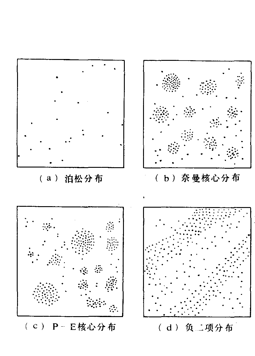 式中 m2=(n-2)(S2-)/2; m1=(n+1)/m2; 为平均数; S2为方差; k为计算次数; n为参数; NPx为理论频数。 P-E核心分布 基本性质与奈曼(Neyman) 分布相同,但其核心群大小相差较大(图C)。当密度增大时常发生核心群邻接合并,有逐步趋向负二项分布的趋势。可认为是泊松分布和正二项分布的复合所致。 ![]() 为样方总数; m1为f1/N; NPx为理论频次数。 负二项分布 种群空间格局极不均匀,呈嵌纹状图形(图d),故又称嵌纹分布,如棉铃虫卵、幼虫,小地老虎幼虫,稻纵卷叶螟卵、幼虫,红蜘蛛等都属此类型。其理论公式为: N(q-p)-k 各项展开后 NPx=N(k+x-1)!/(x!(k-1) q-k-xpx 式中 NPx为理论频数; x=0,1,2,……为取样单位内个体数;k、q、p均为参数,k=x/p;p=s2/-1;q=1+p。 泊松一二项分布 由麦圭尔 (McGuire,et al.)1957年提出。这种分布型随参数的不同,可得到各种n型的泊松—二项式分布。当n→∞时,趋于奈曼分布;当n→0时,趋于负二项式分布。故处于奈曼分布与负二项分布之间。其理论公式为: