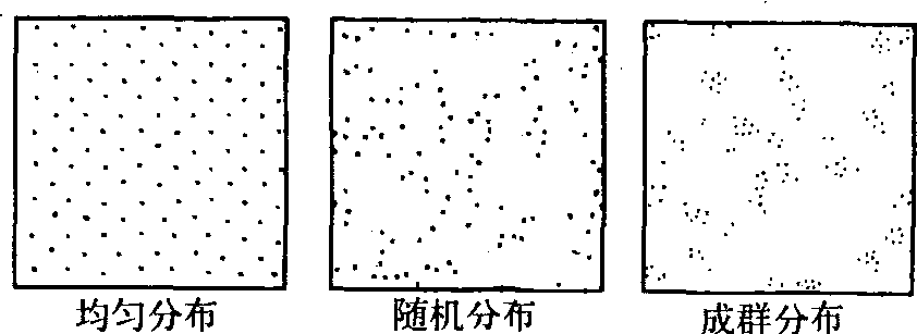 种群分布的三种基本模式 研究某个种群的空间分布,必须先测定个体之间的距离,积累大量数据,应用负二项分布、波松序列、x2拟合度等统计方法,确定种群的分布型。 研究种群的分布型及成群的程度和稳定性,对于确切地了解不同种群的特性,准确地测算种群密度,分析其发展动态是必要的,它对于作物栽培、动物饲养具有指导意义。 |