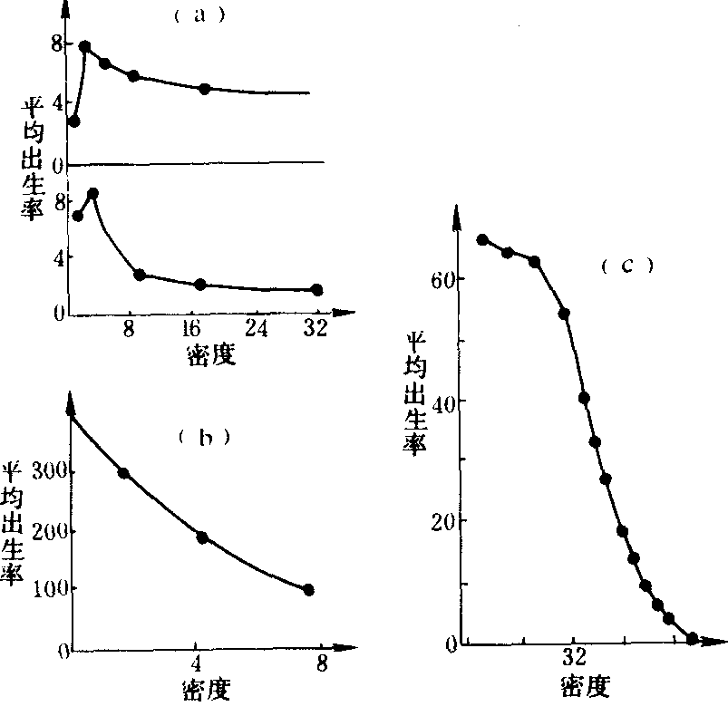昆虫种群密度与出生率关系曲线 (a)阿利型; (b)果蝇型;(c)中间型(仿K. E. F. Watt) 阿利型曲线 瓦特(K. E. F. Watt) 1960年提出描述阿利型曲线的方程