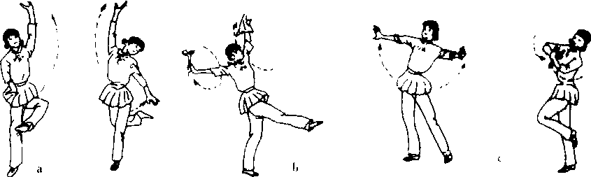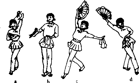 ❺踢毽步:东北秧歌基本舞步。第 一拍前半拍原地双腿蹦跳步一次,后半拍左腿提膝,小腿内翻,左脚内抬成踢毽动作。同时右脚小跳起(图a)。