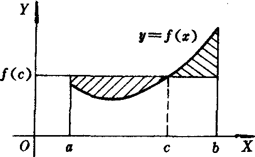 当函数f (x)在区间 [a,b]上连续时,常称 ![]() 为f (x)在 [a, b]上的积分平均值. 由积分中值定理可知,必存在c∈ [a,b],使得f (c)等于f (x)在 [a,b]上的积分平均值.积分中值定理的几何意义是,若f (x)≥0,则连续曲线y=f (x),x轴与直线x=a,x=b所围成的曲边梯形的面积等于以区间 [a,b]上某一点c的函数值f (c)为高,以区间 [a,b] 的长为宽的矩形面积,如图.