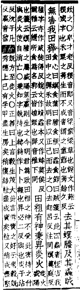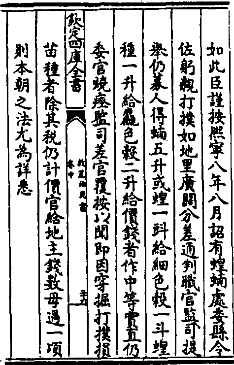 把耕作栽培技术和害虫防治结合起来,是战国时代治虫上的一大创造,《吕氏春秋·任地》说“五耕五耨,必审以尽。其深殖之度,阴土必得”,这样,就能取得“大草不生,又无螟蜮”,既能消灭杂草,又能防治虫害的效果。该书《审时》篇还认为,在栽培上如采用适时种植,就能使大麻“不蝗”,大豆 “不虫”,麦“不蚼蛆”,避免虫害,反映了中国的治虫技术,已从“治”向“防”的方向发展。 汉代,天人感应的迷信思想十分盛行,虫害被说成是“国家将有失道之败,而天乃先出灾害以谴告之”的一种天意儆戒人事的现象,从而影响到对虫害发生原因的认识和对虫害进行有效地防治。东汉时王充驳斥了这种迷信观点,他在《论衡·商虫》篇中指出,虫害发生同温湿度等环境条件有密切关系,“虫以温湿生也”, “谷干燥者, 虫不生; 温湿, 虫生不禁”,这种从环境条件来考虑和认识虫害发生的原因,在虫害防治史上具有重要的科学意义。 对害虫的防治,汉代已从农作物扩大到桑树,从大田发展到仓库、为文献记录下来的害虫,除螟、蝗而外,还有白鱼、虸蚄、蝎等,虸蚄即粘虫,蝎即桑天牛。防治的方法也有进步,创造了“堑道作坎、榜驱内于堑坎”的掘沟捕蝗法,用曝晒和放干艾防虫的藏种法,用马粪或附子汁渍种的播前种子处理法,这也是中国古代明确记载用药物防治农业害虫之始。 晋代,中国出现了生物防治技术。这种技术首先使用于南方的柑橘园中,即利用一种大于常蚁的赤黄色蚁类(即黄猄蚁) 防治柑橘园中的害虫,《南方草木状》(嵇含撰,304年问世)一书记载说:“南方柑树,若无此蚁,则其实皆为群蠹所伤,无复一完者矣。”人类利用生物防治虫害,以这一记载为最早。 北魏时期的重要农书《齐民要术》记载,当时的治虫技术有劁麦法藏麦种,用牛羊骨诱杀瓜类蚁类,选用抗虫品种,用水沤、火煏的措施防木材生虫等,防治技术有明显地发展。 唐开元四年(716年),山东发生大蝗灾,朝廷命官均视蝗为天灾,主张“修德”治蝗,反对 “制以人事”。唐玄宗李隆基犹疑不决,宰相姚崇,挺身而出,力主捕蝗,表示“若救人杀虫,因缘致祸,崇请独受义,不仰关”,并进一步表示“若除不得,臣在身官爵,并请削除”,态度坚决,终于动员灾区官民扑灭了这次蝗灾,仅汴州一地,就捕得蝗虫十四万石。这次捕蝗的胜利,宣告了天人感应思想在虫害防治上的破产,对提高人们虫害应治,虫害可治的认识,有着重大的意义。姚崇在倡导这次捕蝗中,根据“蝗既解飞,夜必赴火”的生活习性,又创造了“夜中设火、火边掘坑,且焚且瘗”的开沟诱杀捕蝗法,为迅速扑灭大片蝗害创造了条件,这是中国古代治蝗史上光辉的史迹之一。 保护害虫天敌,开始受到人们的重视,《新五代史》中已有隐帝乾祐年间(948~950年)因鸜鹆能食蝗,下令禁捕鸜鹆的记载。 蝗虫是中国古代为害最烈的害虫,治蝗一直是历代治虫工作的重点。宋代,中国开始制订治蝗法,宋神宗熙宁八年(1075年)八月颁布的熙宁诏书(图2),宋孝宗淳熙时(1174~1189年)颁布的淳熙敕,可以说是中国历史上最早颁布的两个治蝗法规。这两个法规,分别对治蝗的要求和奖励办法作了具体规定,后者还规定了惩罚办法,从而将治虫工作用法的形式规定下来。南宋董煟的《救荒活民书》收录有“捕蝗法”七条,对于如何组织捕蝗以及灭蝗的技术,都有具体的说明,表明到宋代,中国在治蝗工作上已积累了相当丰富的经验。对于蔬菜、花卉害虫的防治,这时已相当重视,油剂、硫磺、石灰等,这时也已用于治虫。