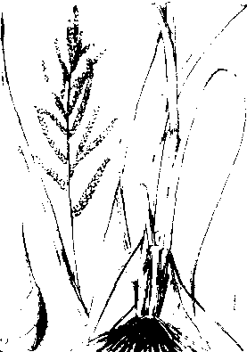 稗 1.植株 2.小穗 稗一年生草本,秆高50—150厘米。叶片条形,扁平。圆锥花序直立,近尖塔形,小穗卵形,具短柄或近于无柄。花果期6—8月。产米泉、玛纳斯、塔城、伊吾、吐鲁番、和田等地。是家畜的优良牧草。 |
