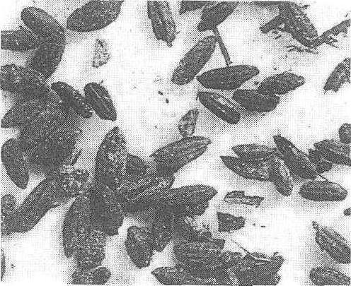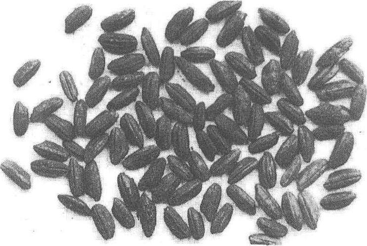 图1 浙江桐乡罗家角出土稻米 出土的大量炭化稻谷(见图2)和农作工具,尤为引人注目,距今已近7000年。它们都是世界上最早的稻谷遗存之一。黄河流域也发现了不少距今已有四五千年新石器时代的水稻遗存,如河南渑池仰韶文化遗址、河南淅川黄楝树村和山东栖霞杨家园遗址,充分说明黄河流域稻作栽培的历史也很悠久。