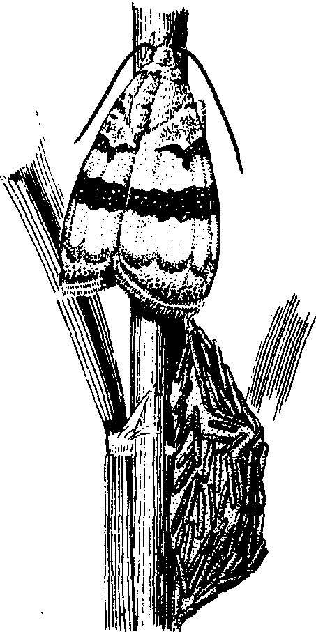| 释义 | 稻穗瘤蛾rice nolid水稻穗期主要害虫。又名稻穗点瘤蛾。学名Celama taeniata(Snel-len)。鳞翅目,灯蛾科。分布于亚洲和大洋洲;中国华东、华中地区较常见。以幼虫食害水稻、棉、桑、苜蓿、木贼等。成虫体长5.6~6毫米、翅展13~16毫米,白色,前翅内横线及外横线黑褐色,混有银色鳞片,线内外两侧还有茶褐色线,构成阔带;亚外缘线茶褐色,呈断续状。卵扁圆,直径约0.4毫米,色灰白。卵壳上有33条纵棱,棱间具横道。幼虫共5龄,末龄幼虫体长10~13毫米,黑色,被黑色长毛,胸腹部均有毛瘤,前胸3对,中、后胸和第一至第六腹节各4对,第七、八腹节各3对,第九腹节1对。蛹长约5毫米,外有黄白色小茧(见图)。